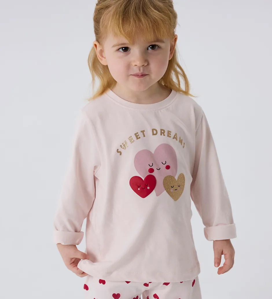 Charmerende Name It nattøj i creme med lange ærmer og fint hjerteprint. Nattøjet er todelt. Natblusen har et sødt “Sweet Dreams” print, mens bukserne prydes af små røde hjerter og flæsedetaljer ved anklerne.