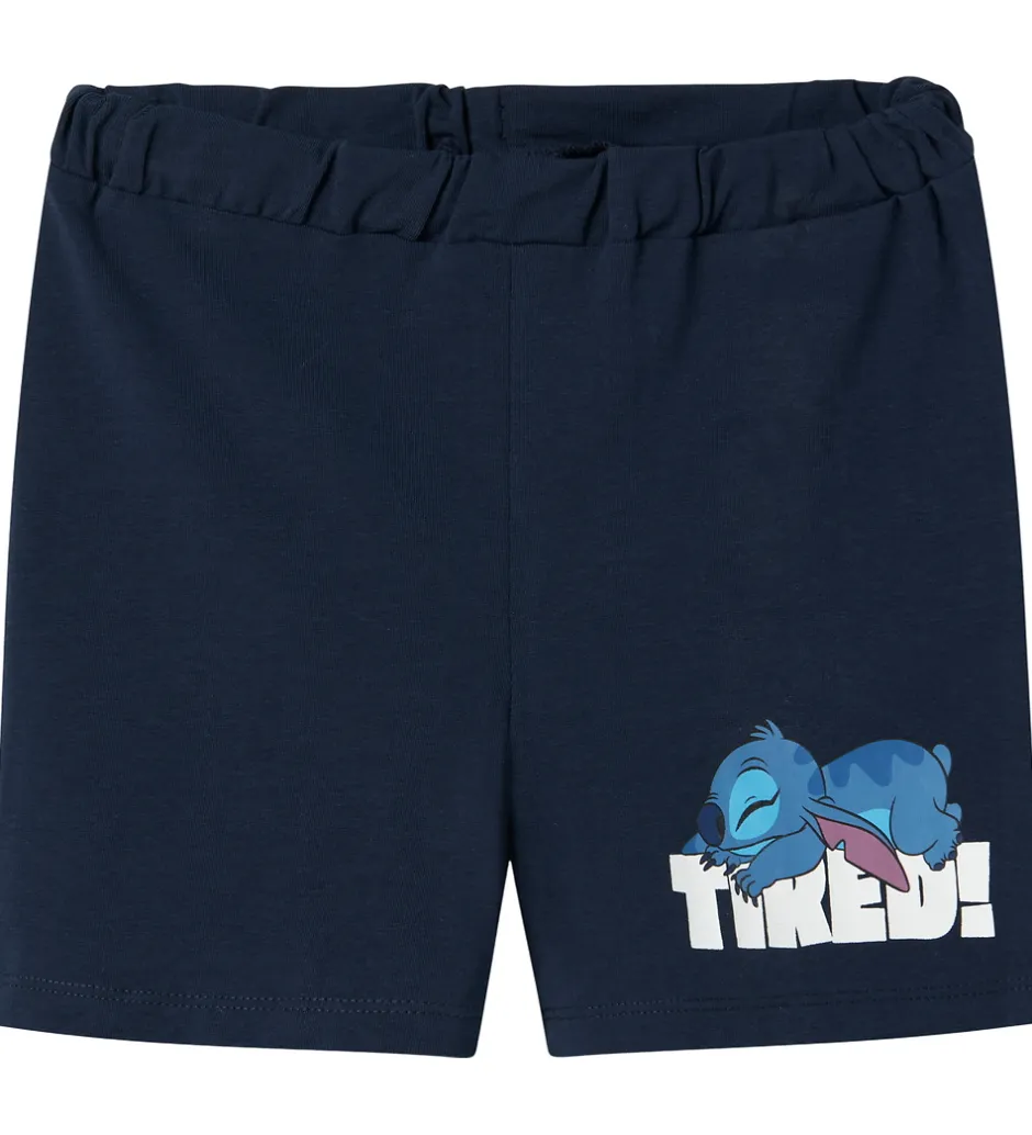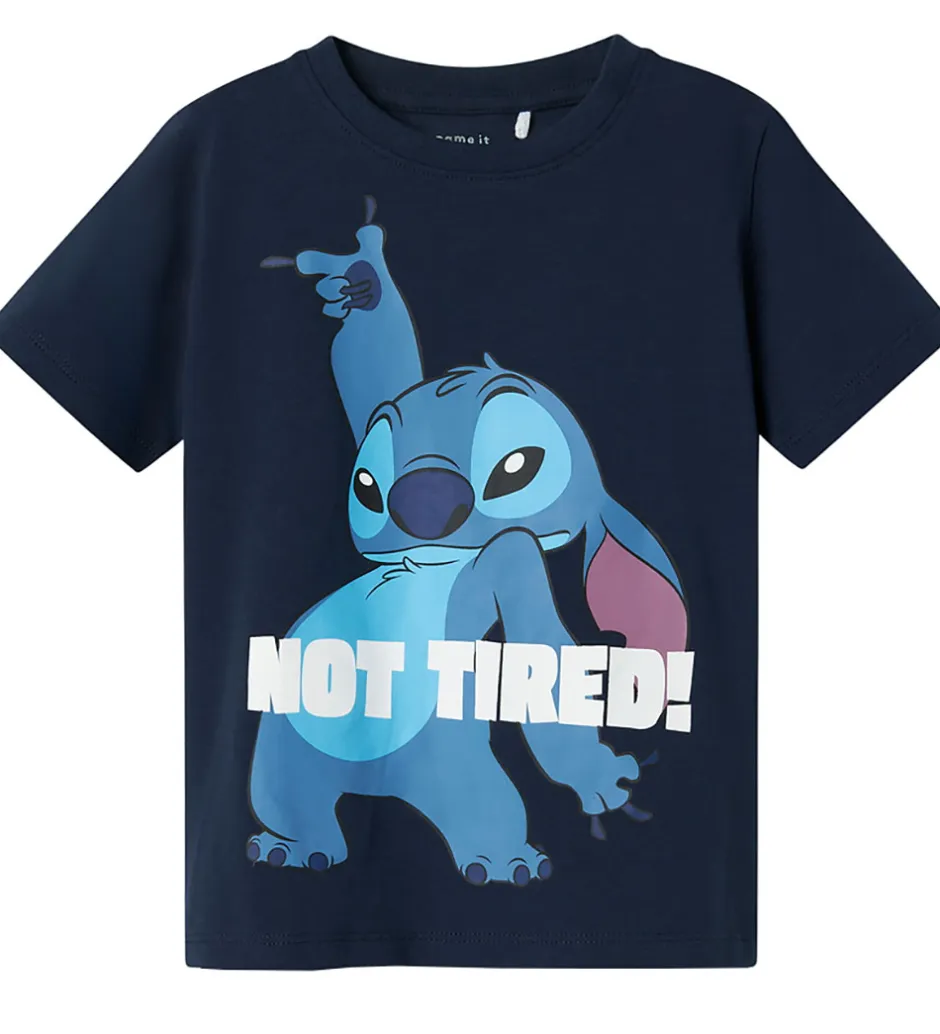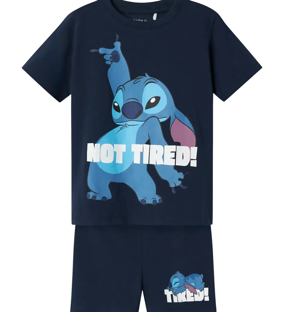Dejligt Name It nattøj med en kortærmet t-shirt i en dyb, blå nuance. T-shirten prydes af et stort print af Stitch med teksten “Not Tired!”. De matchende shorts har et mindre print af den samme karakter.