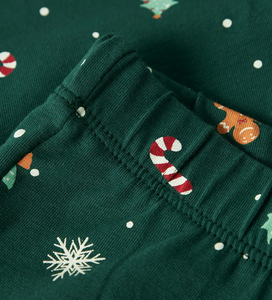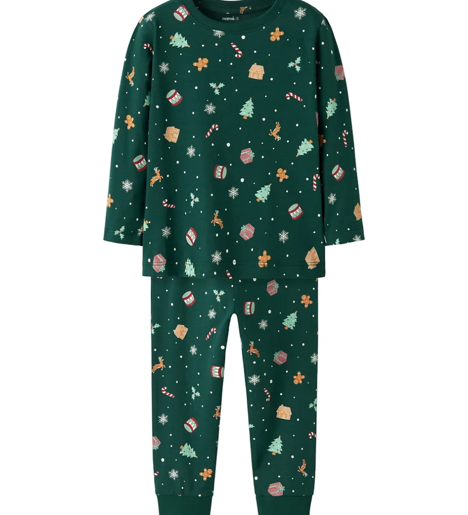 Smart Name It nattøj bestående af en natbluse og et par natbukser i mørkegrøn med alloverprint af julemotiver. Natblusen har en rund halsudskæring med en smal ribkant og lange ærmer. Natbukserne har en god elastik i taljen, og i benåbningerne er der brede ribkanter.