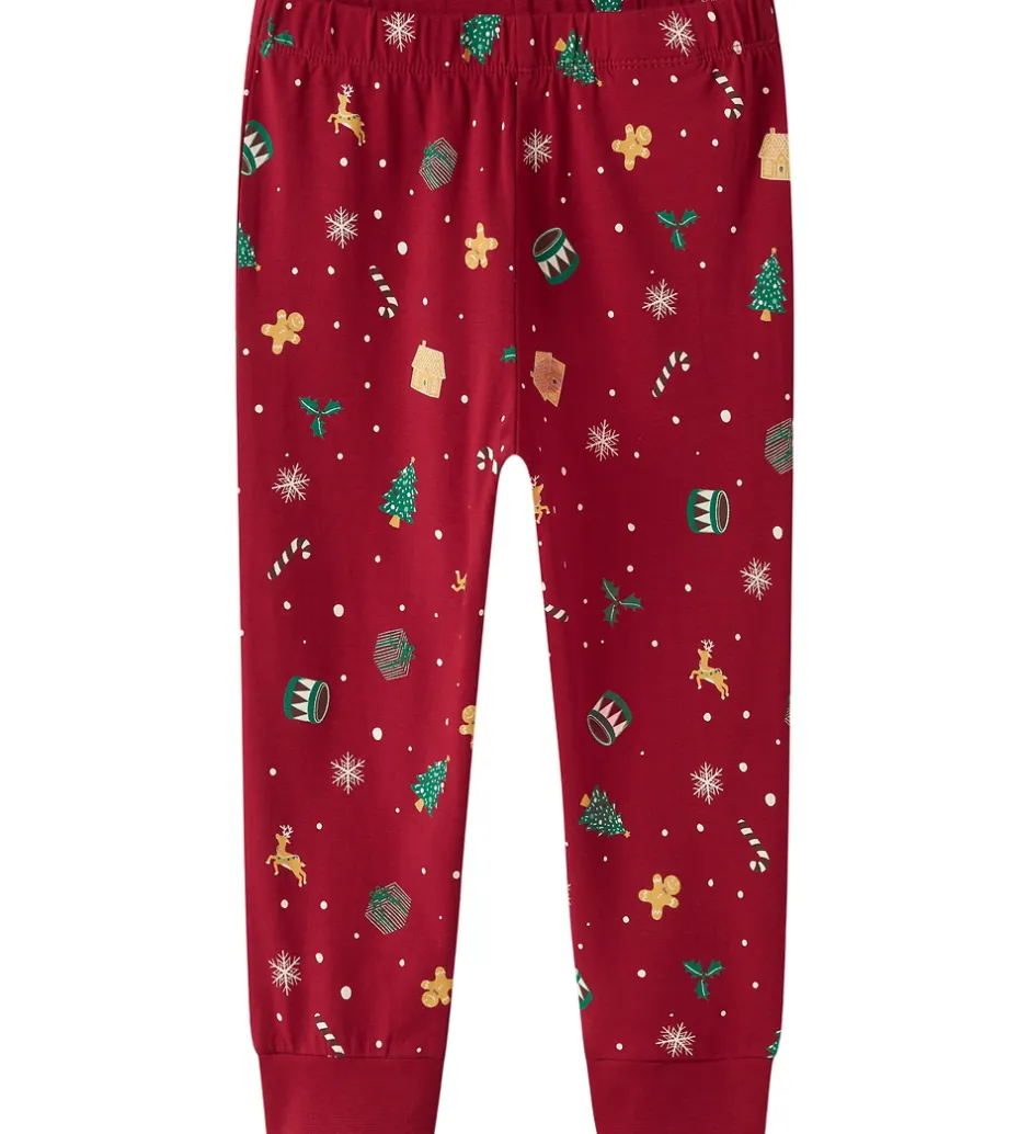 Fint Name It nattøj bestående af en natbluse og et par natbukser i rød med alloverprint af julemotiver. Natblusen har en rund halsudskæring med en smal ribkant og lange ærmer. Natbukserne har en god elastik i taljen, og i benåbningerne er der brede ribkanter.