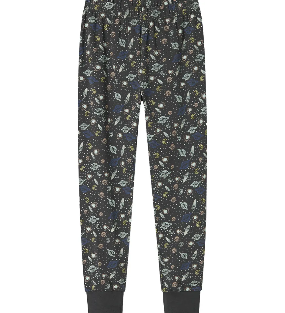 Skønt Name It nattøj, som er 2-delt med en natbluse og et par natbukser i mørkegrå med et allover-rumprint, der sikrer en god nat.