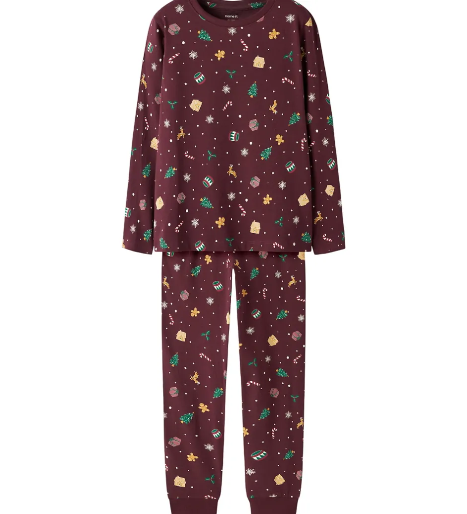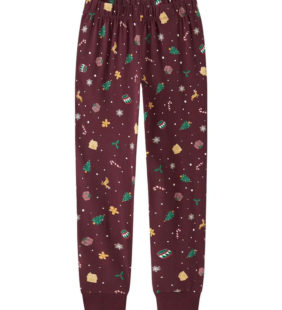 Charmerende Name It nattøj i bordeaux med et alloverprint af julemotiver. Nattøjet består af en langærmet natbluse og et par natbukser med elastik i taljen og ribkanter ved anklerne.