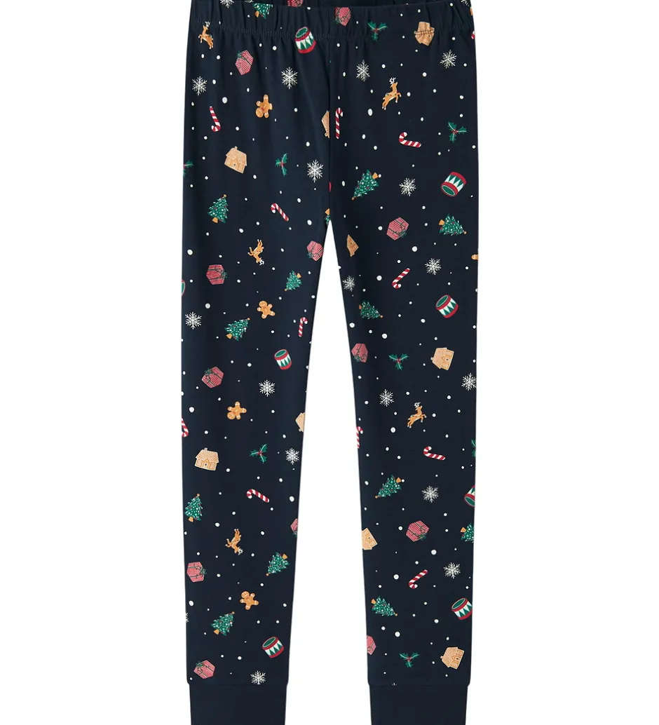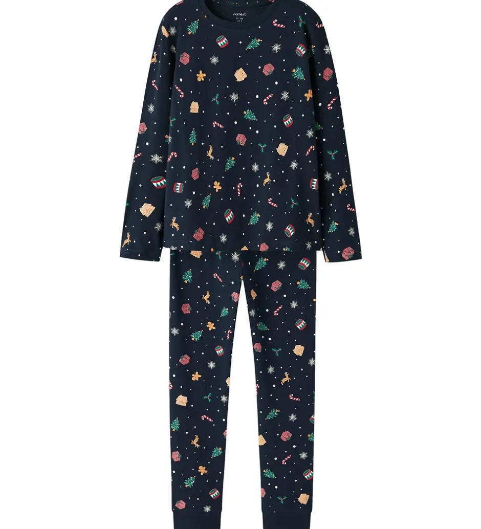 Skønt Name It nattøj i navyblå med et alloverprint af julemotiver. Nattøjet består af en langærmet natbluse og et par natbukser med elastik i taljen og ribkanter ved anklerne.