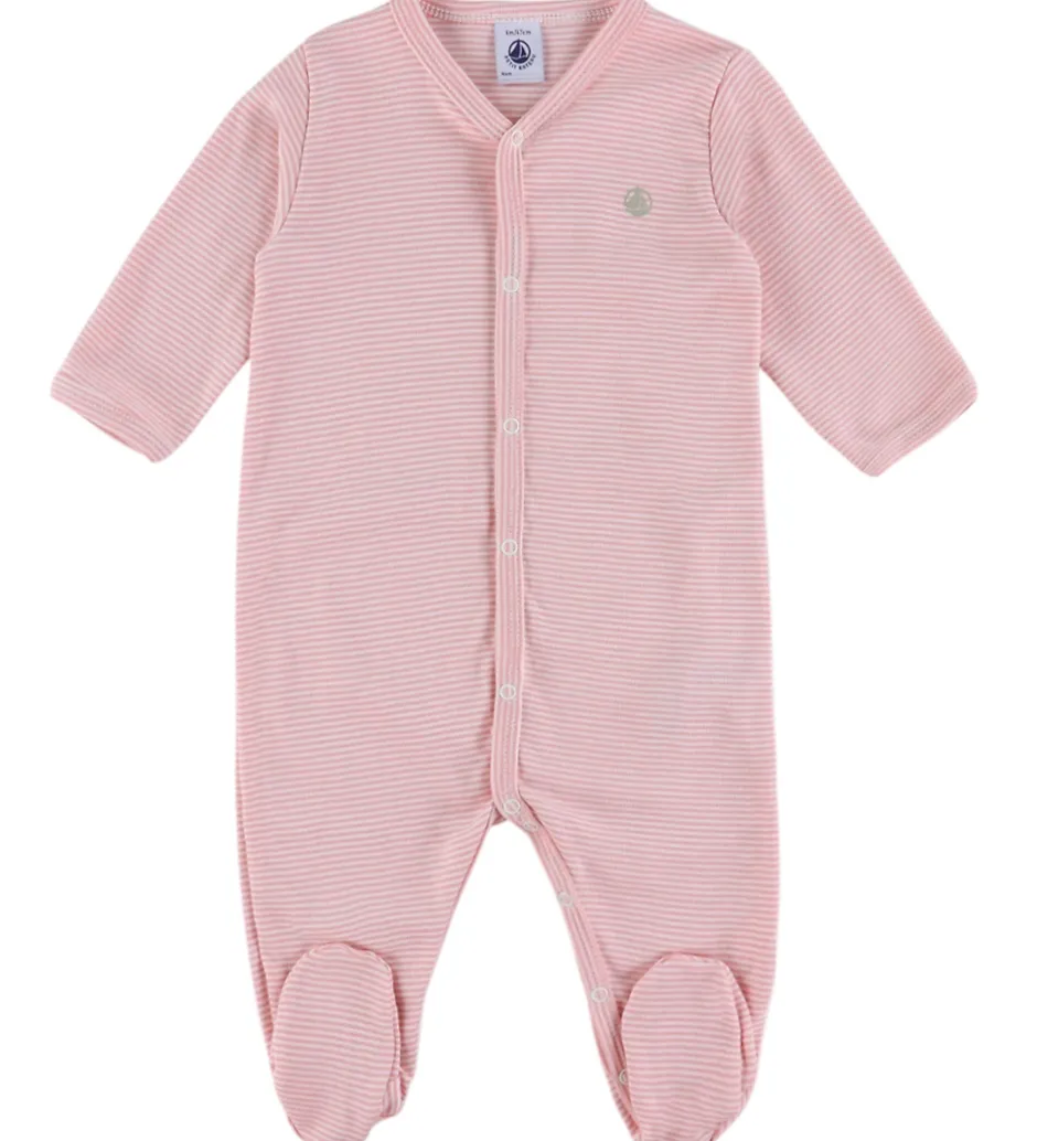Petit Bateau natdragterne har lange ærmer og ben, og den har faste fødder. Natdragterne har smalle ribkanter i alle åbninger, og den kan åbnes fortil med gennemgående trykknapper samt mellem benene med yderligere trykknapper.