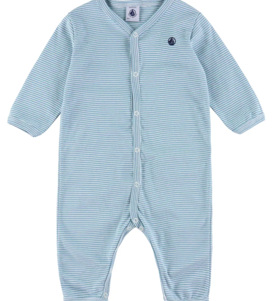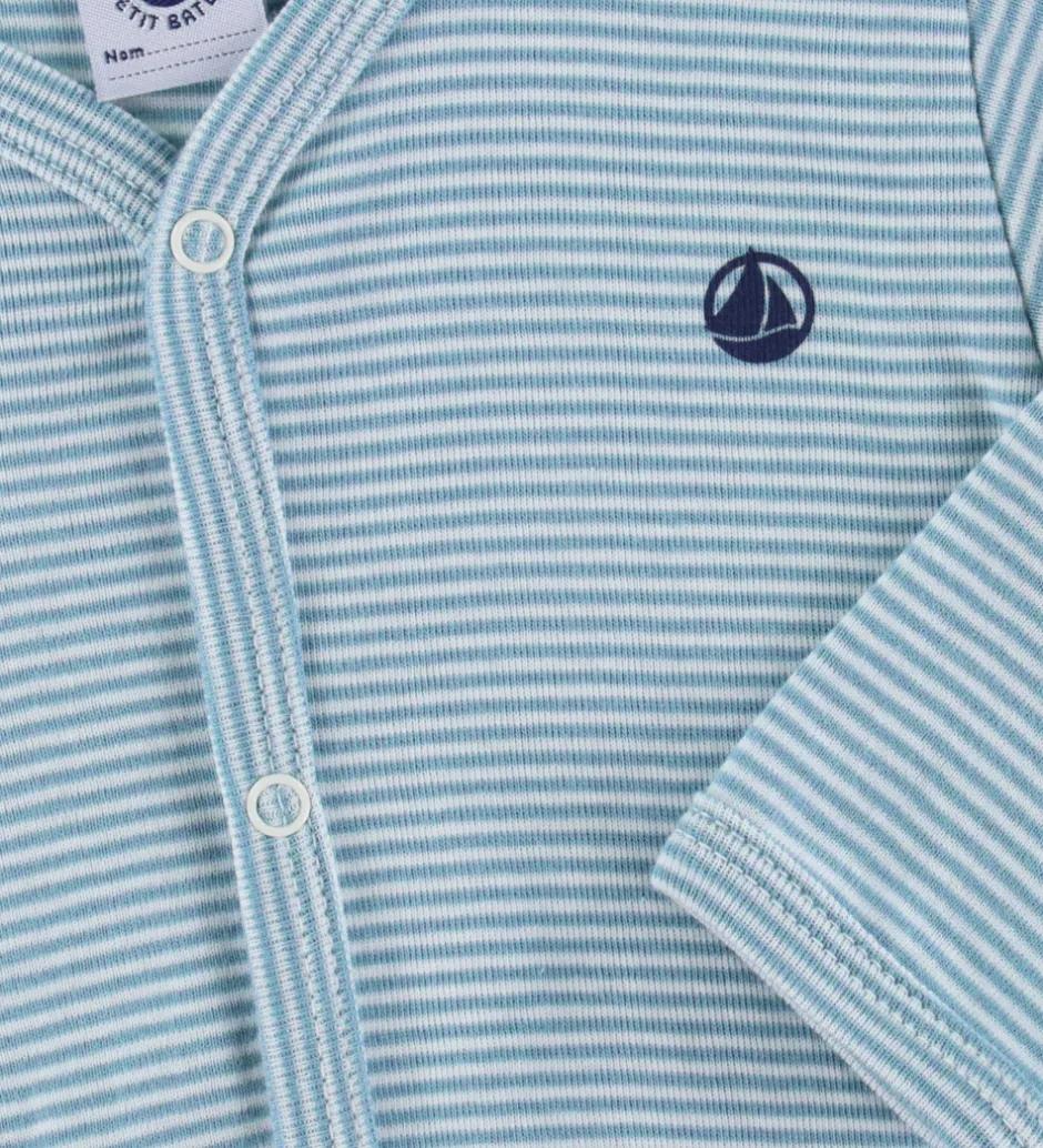 Fin Petit Bateau natdragt med lyseblå og hvide striber. Et Petit Bateau logo pryder det venstre bryst for en fin detalje.