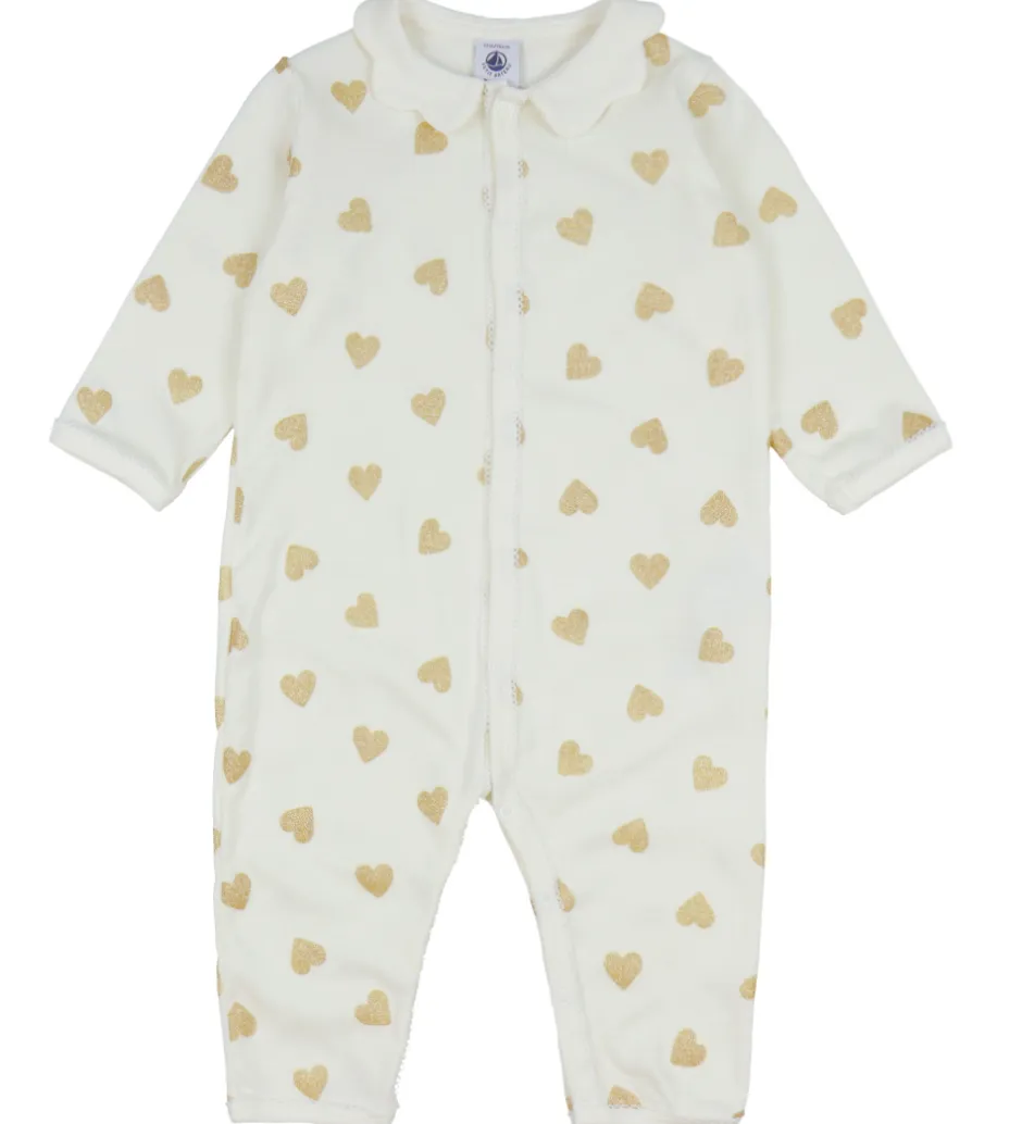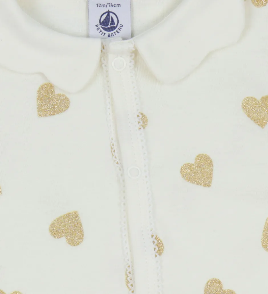 Dejlig natdragt fra Petit Bateau i en blød hvid med et alloverprint af små, gyldne glimmer hjerter. Den er udstyret med søde blondedetaljer omkring åbningerne.