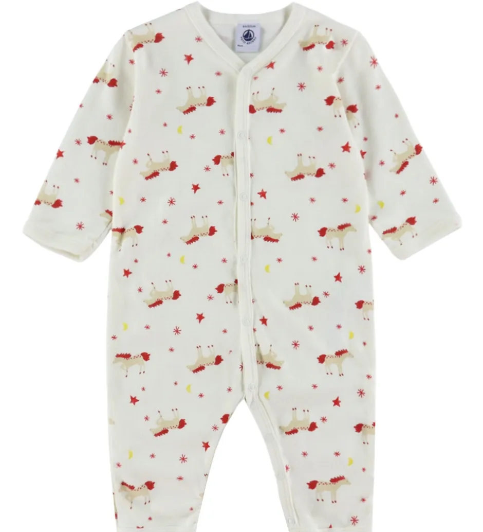 Petit Bateau natdragten har lange ærmer og ben, og der er smalle ribkanter i ben- og ærmeåbningerne. Den kan åbnes fortil med gennemgående trykknapper samt mellem benene med yderligere trykknapper.
