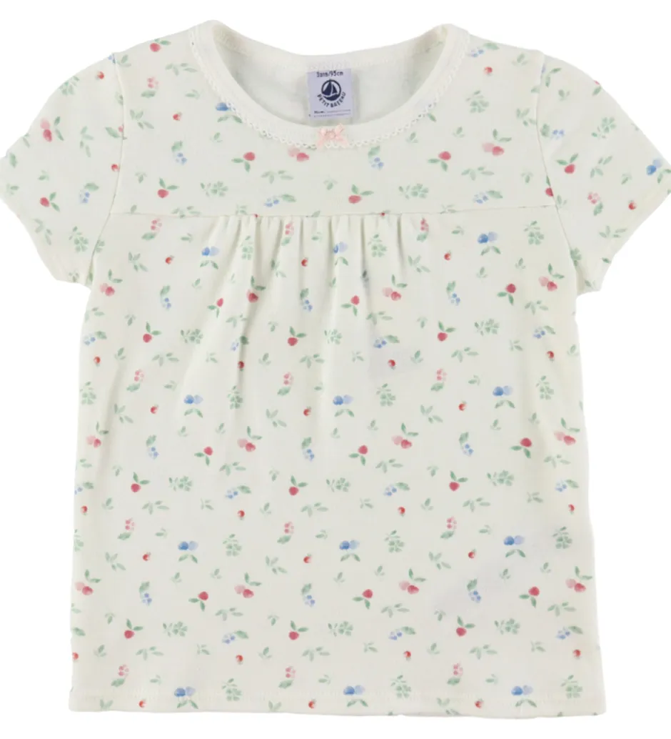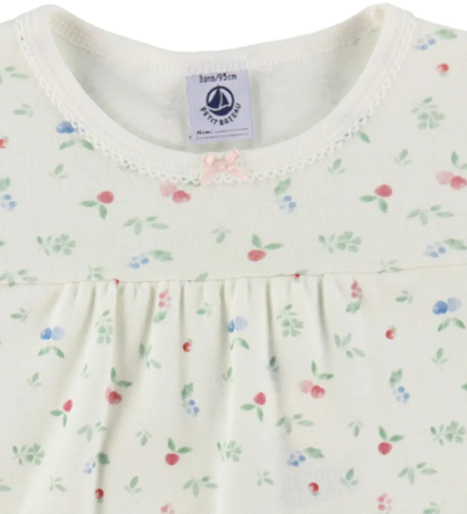 Sødt Petit Bateau nattøj bestående af en t-shirt og et par shorts i hvid med et allover blomsterprint i grøn samt fine bær i blå og rød nuancer.