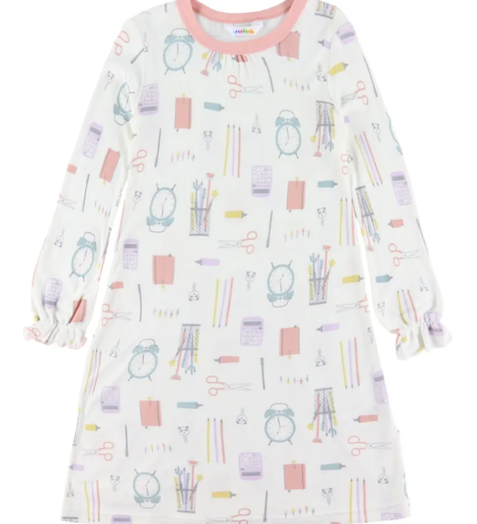 Fin natkjole fra Joha i hvid med farverigt print af skoleartikler. Natkjolen har lange ærmer og en rund halsudskæring med rosa kant. Elastiske kanter ved håndleddene giver en flot pasform. Kjolen er fremstillet af bambus viskose.