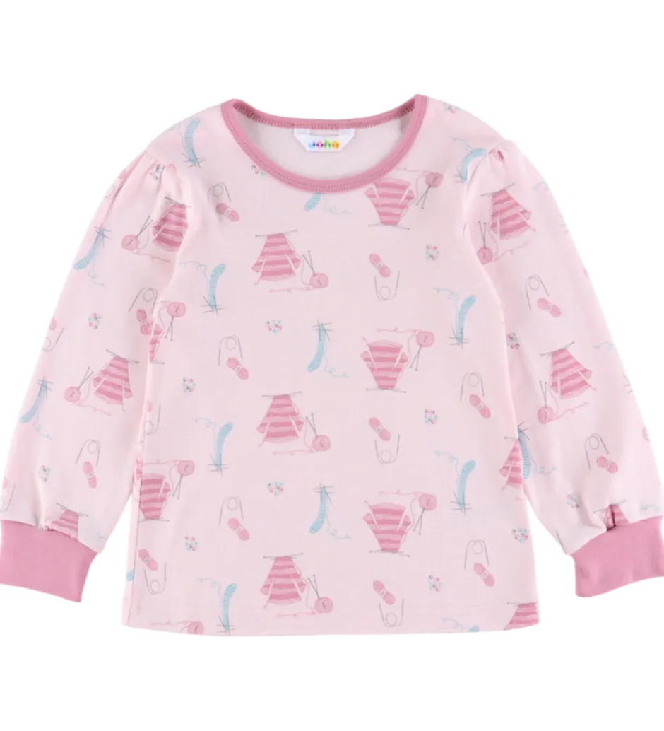 Skønt Joha nattøj bestående af en natbluse og et par natbukser. Natblusen er lys rosa med print med strikketema og mørkere rosa kanter. Den har en rund halsudskæring og lange ærmer med puf ved skuldrene og brede ribkanter. Natbukserne er mørk rosa. De har en god elastik i taljen, som giver en god pasform.