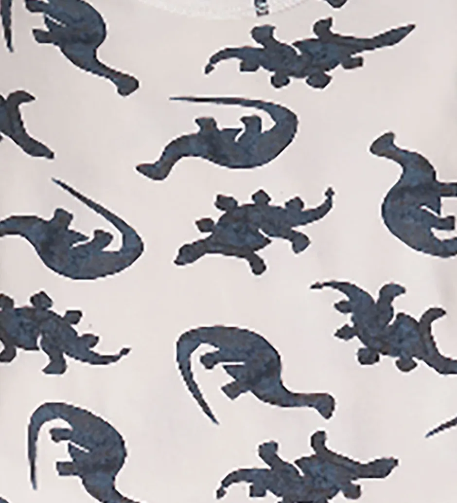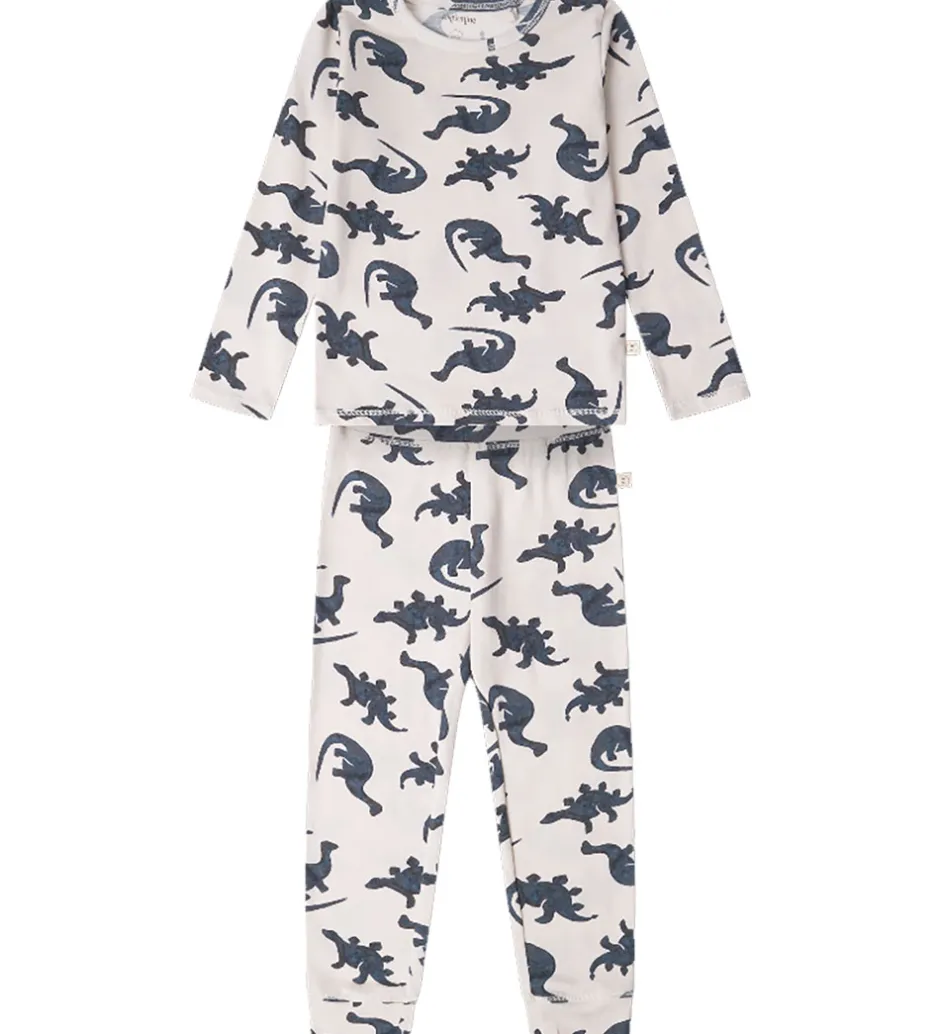 Behageligt Thats Mine nattøj bestående af en natbluse og et par natbukser. Begge dele er i lysebeige med et sjovt dinosaurprint i blå nuancer. Natblusen har lange ærmer og en rund halsudskæringen. Natbukserne har en elastisk talje, der sikrer en god pasform.