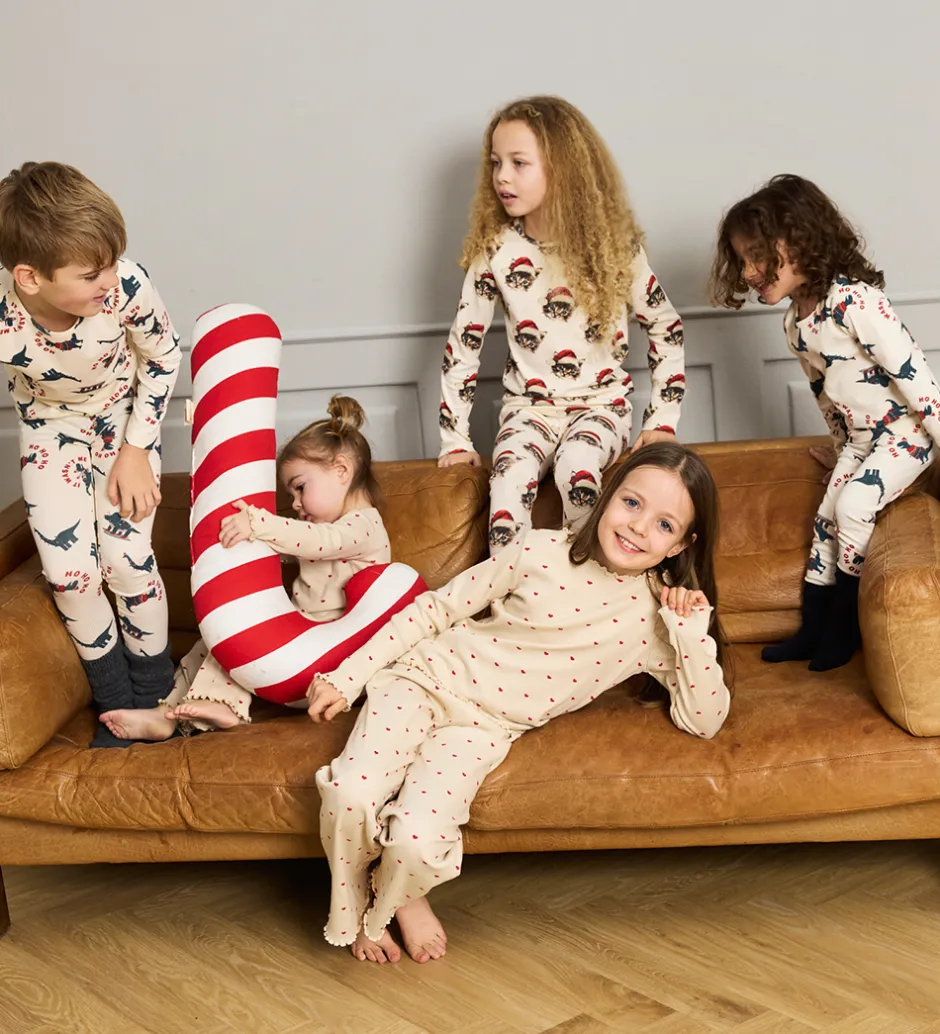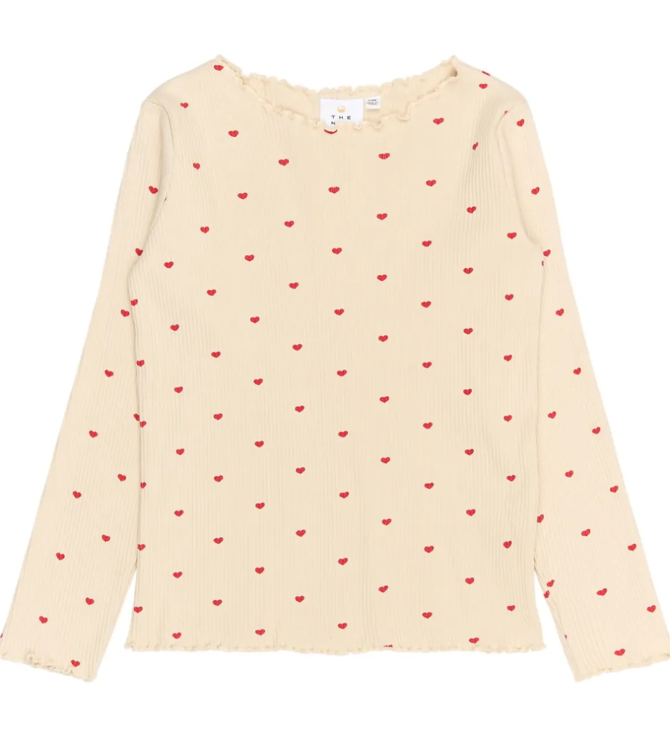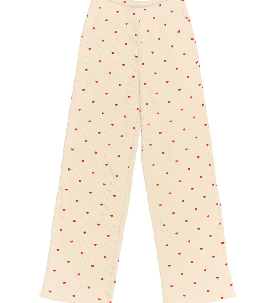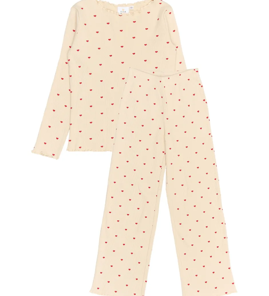Charmerende The New nattøj bestående af en natbluse med lange ærmer og et par natbukser i en cremehvid nuance prydet med et sødt rødt hjerteprint. The New sættet er behageligt og stilfuldt til afslappede stunder.