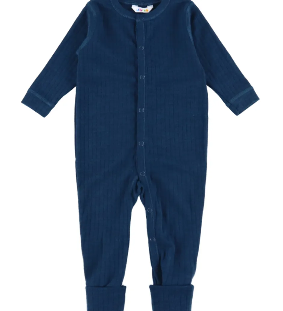 Elegant Joha natdragt med lange ærmer i en dyb, marineblå farve. Natdragten har en ensartet, ribbet struktur og lukkes med praktiske trykknapper langs fronten. Smarte foldedetaljer ved ben giver et stilrent udtryk.
