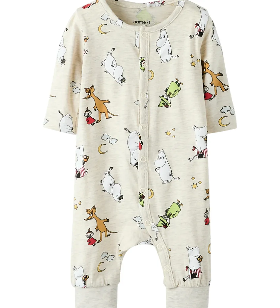 Charmerende Name It natdragt i gråmeleret med et alloverprint af motiver fra Mumitroldrene. Natdragten har lange ærmer og lange ben med trykknapper fra hagen til venstre ankel.