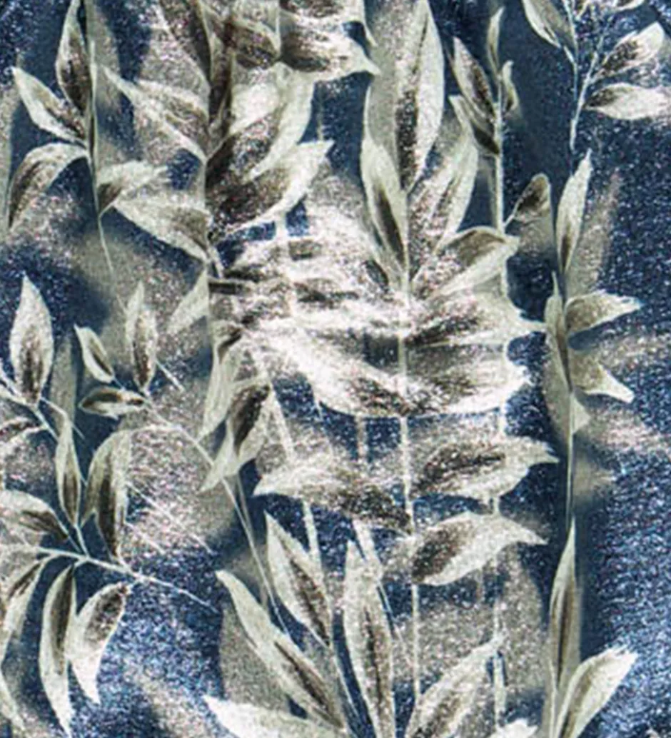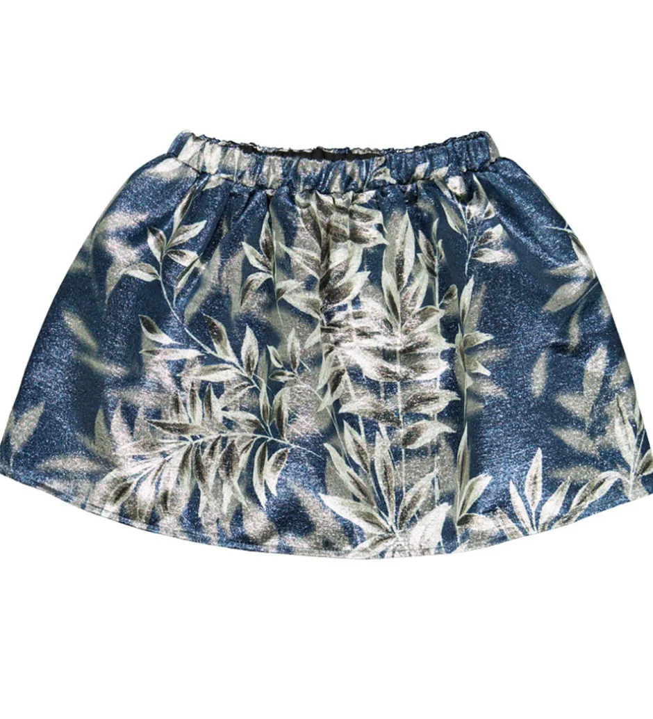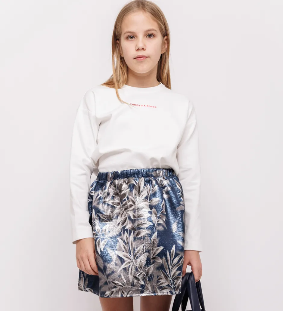 Flot Christina Rohde nederdel i mørkeblå med et smukt, skinnende bladprint i hvide og sølvnuancer. Nederdelen har en behagelig elastikkant i taljen, som sikrer en god pasform. Den løse og lette stil gør nederdelen ideel til både hverdag og festlige anledninger.