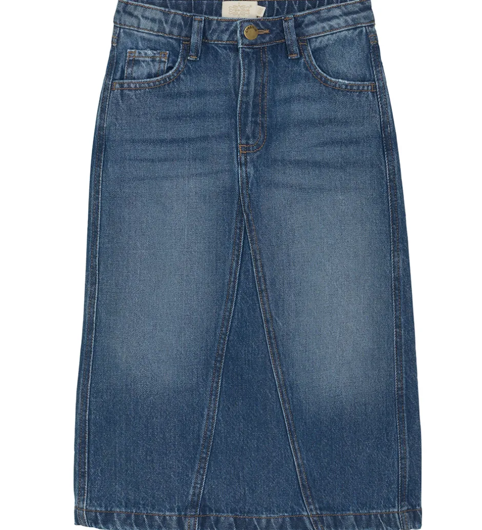 Sej Creamie nederdel i en klassisk blå denim. Nederdelen åbnes fortil med en trykknap og lynlås, og i kanterne har den smarte slidte detaljer. Creamie nederdelen er ideel til både hverdag og leg.