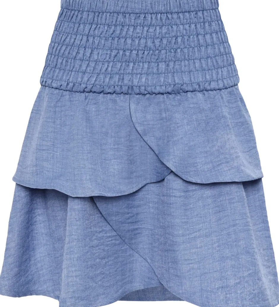 Fin Grunt nederdel i en blå nuance med flotte lag og bred elastisk talje. Den bløde nederdel er både behagelig og stilfuld, ideel til forskellige anledninger.