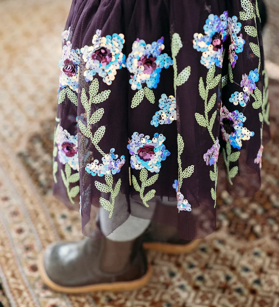 Smuk Hust and Claire nederdel i mørklilla tyl med blomstermotiver, dannet af palietter i grønne, blå og lilla nuancer.