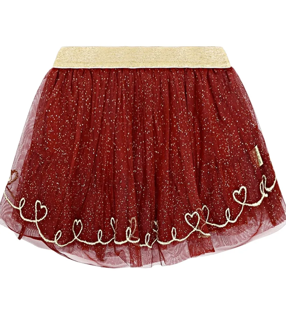 Elegant Hust and Claire nederdel i rødt tyl med guldprikker, og langs kanten af skørtet er der broderet en stribe af guld, som former som hjerter. I livet har den en kant med guldglimmer, og nedenunder falder skørtet med masser af vidde. På indersiden er der et ekstra lag af bomuldsjersey, så tylnederdelen ikke fremstår gennemsigtig.