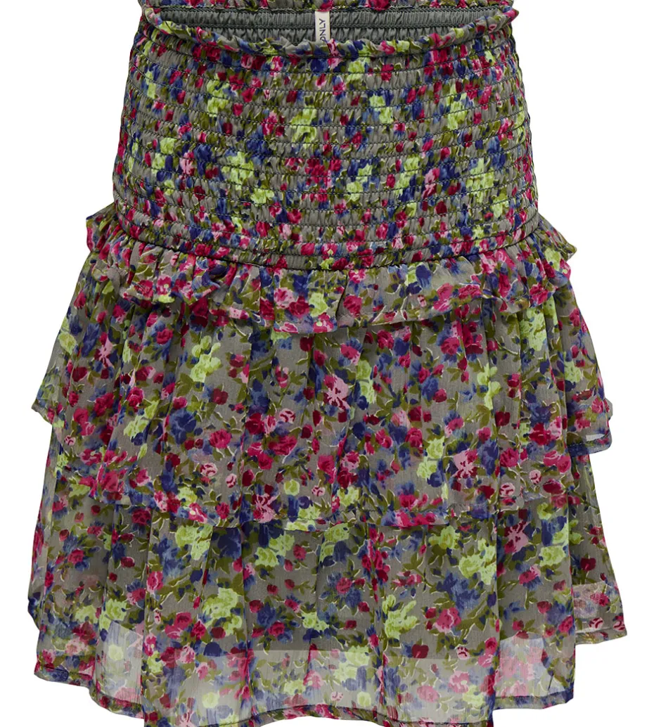 Skøn Kids Only nederdel i grå med et alloverprint af blomster i grønne, blå og rosa nuancer.