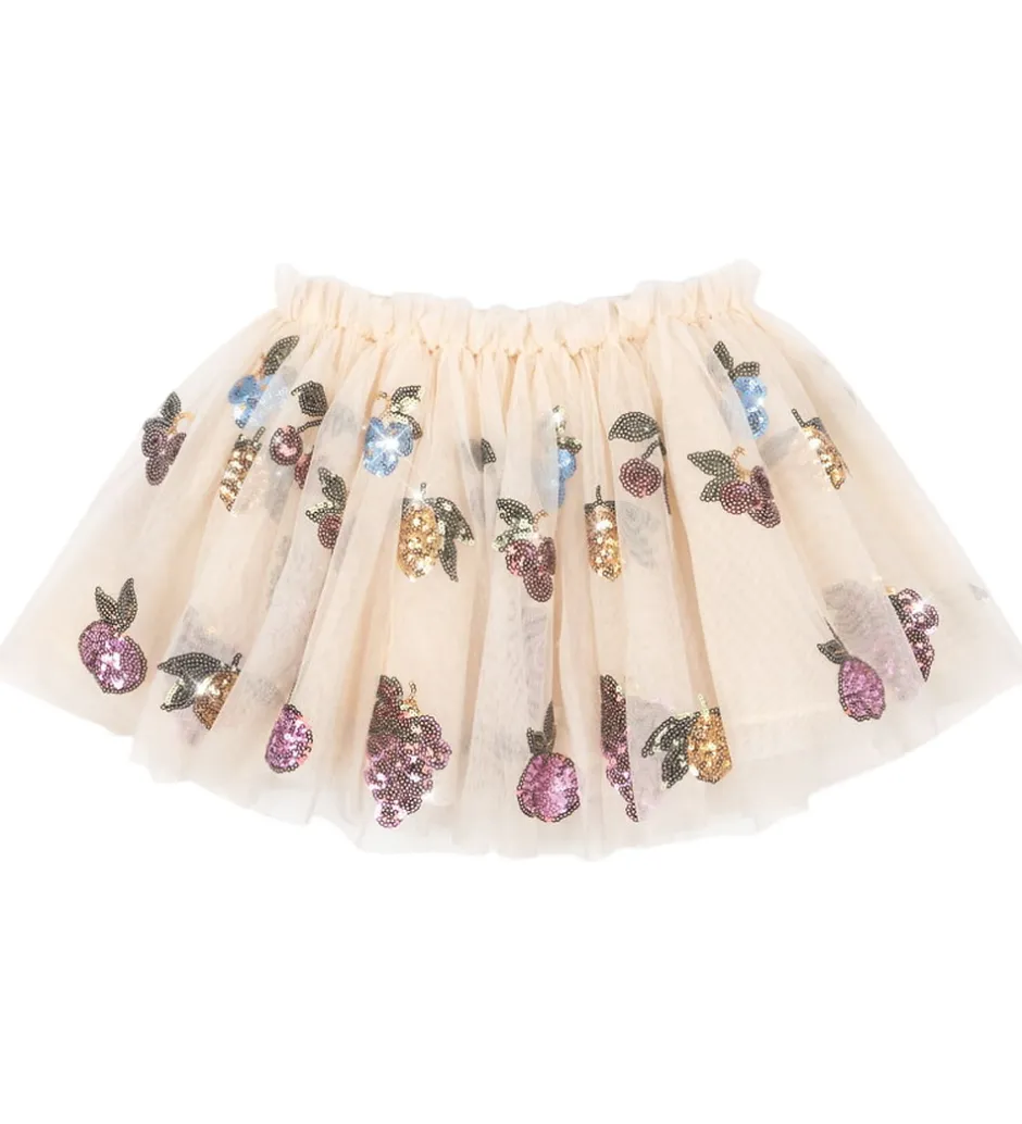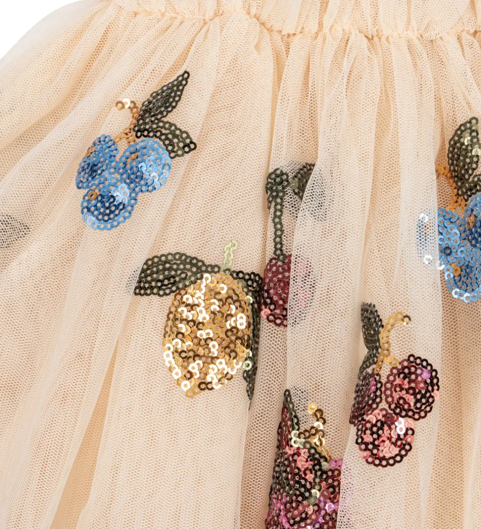 Elegant Konges Sløjd tylnederdel i en lysebeige farve med broderede frugtprint af farverige pailletter. Konges Sløjd nederdelen har et skørt med elastisk talje for en god pasform.