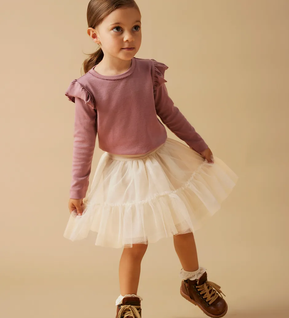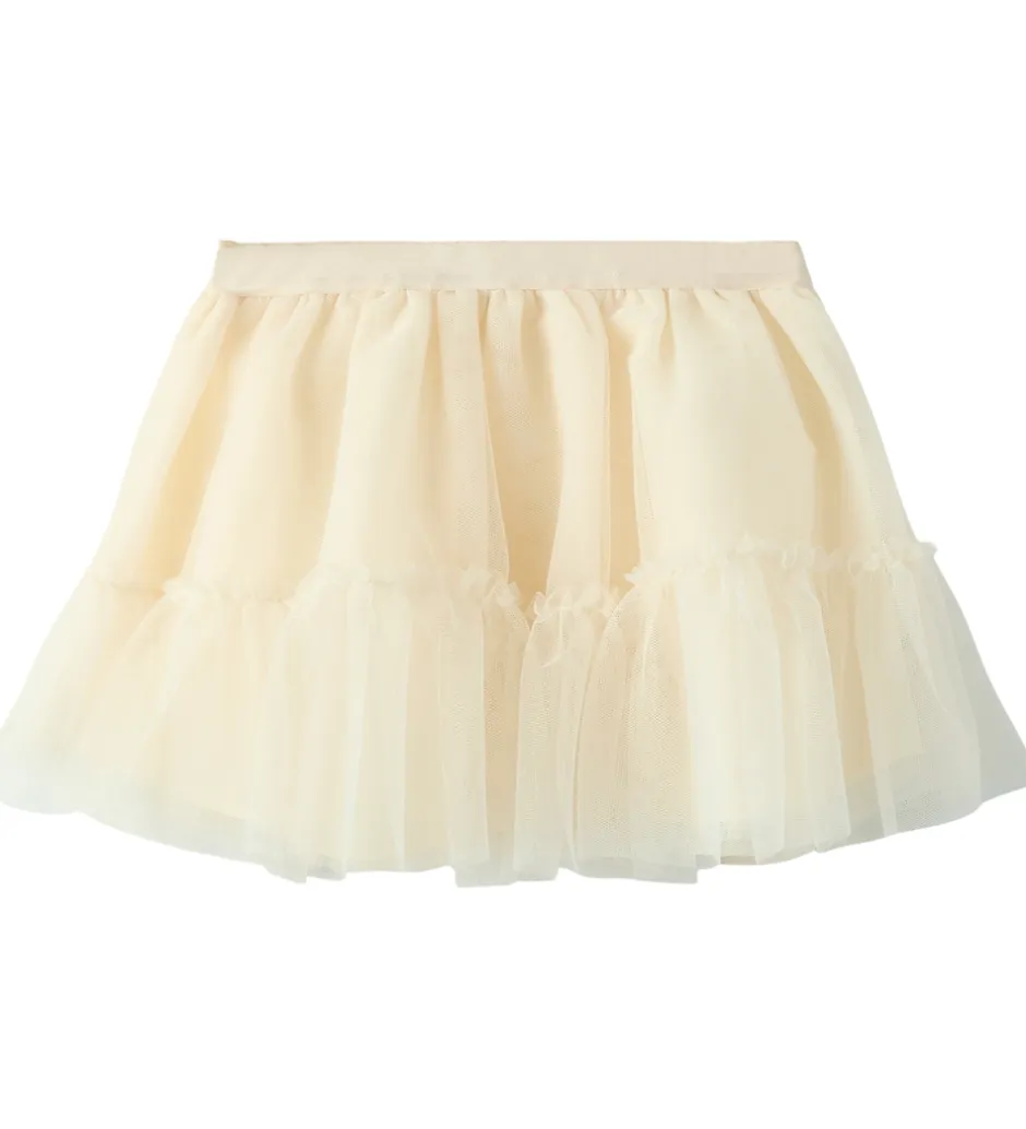 Elegant Lil Atelier nederdel i lys beige med flere lag af blødt tyl. Lil Atelier nederdelen har en elastisk talje, der sikrer en god pasform. Inderst er der et lag økologisk bomuld, som er behagelig mod huden.