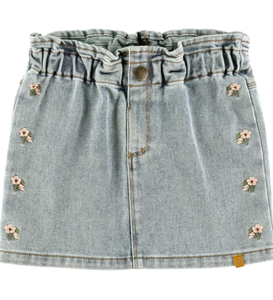 Elegant Lil Atelier nederdel i lyseblå denim med små blomsterbroderier langs siderne i rosa og grøn. Lil Atelier nederdelen har en elastisk talje, som kan justeres med knapper indvendigt. Nederdelen lukkes foran med en trykknap, og bagpå er der praktiske lommer.