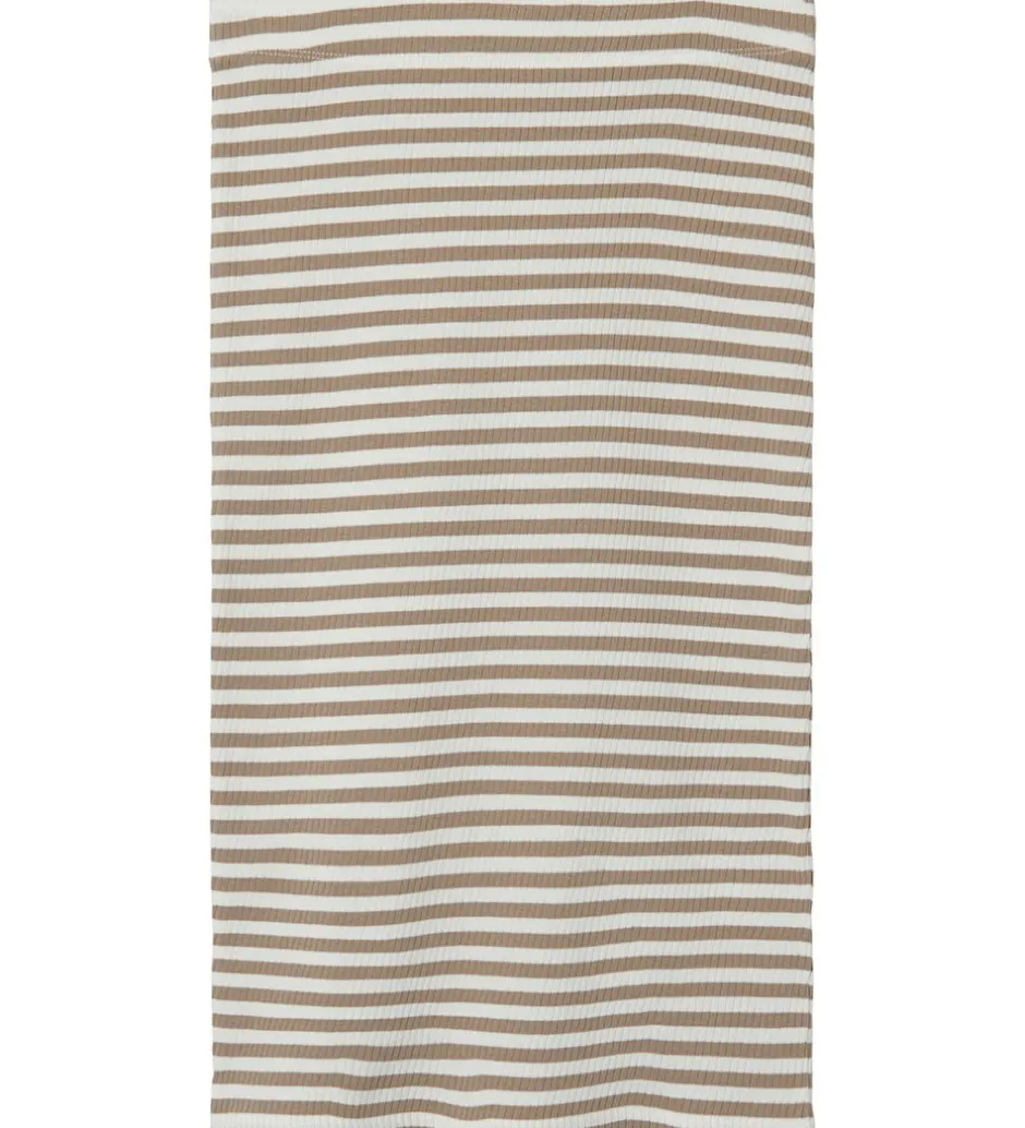 Lækker LMTD nederdel i stribet hvid og lysebrun i flot ribkvalitet. Nederdelen har en tætsiddende pasform med meget stræk, som sikrer god bevægelse og komfort. I taljen er der en bred elastikkant, som kan justeres med knapper indvendigt. LMTD nederdelen er et stilfuldt valg til enhver garderobe.