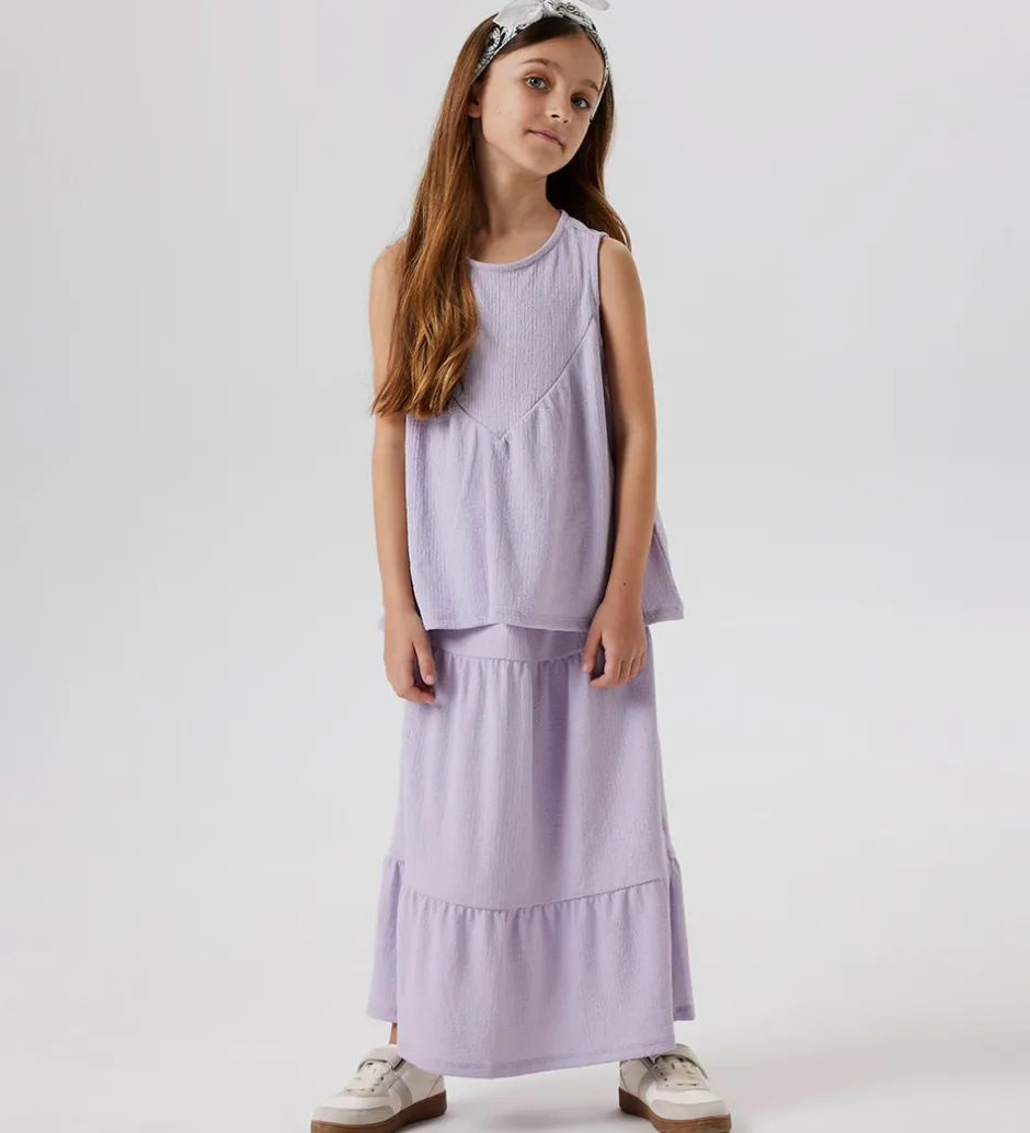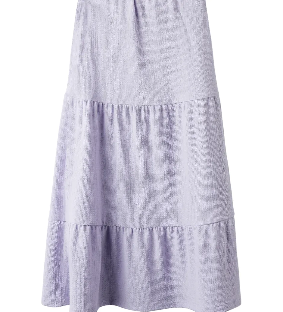 Elegant Name It nederdel i en lys, lilla nuance. Nederdelen har en let struktur, der giver et flot fald. Name It nederdelen har en blød elastik i taljen, som sikrer en god pasform.