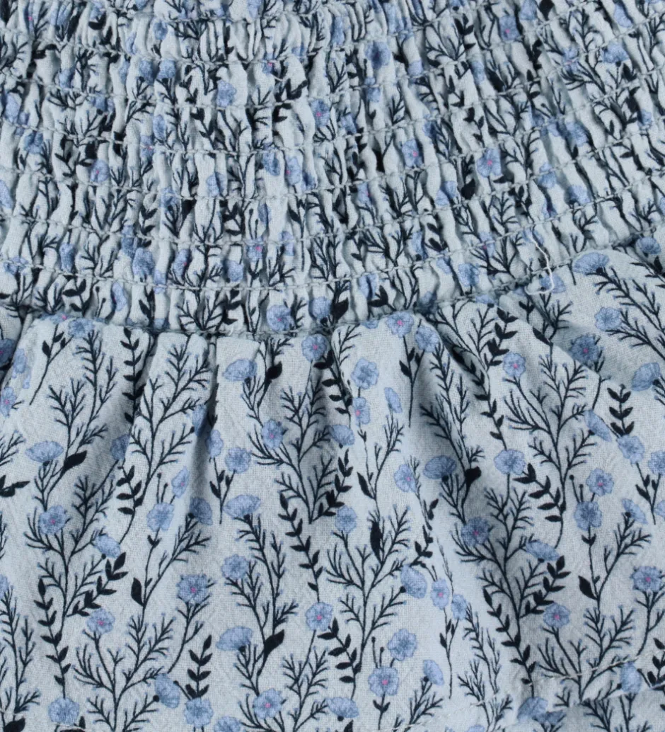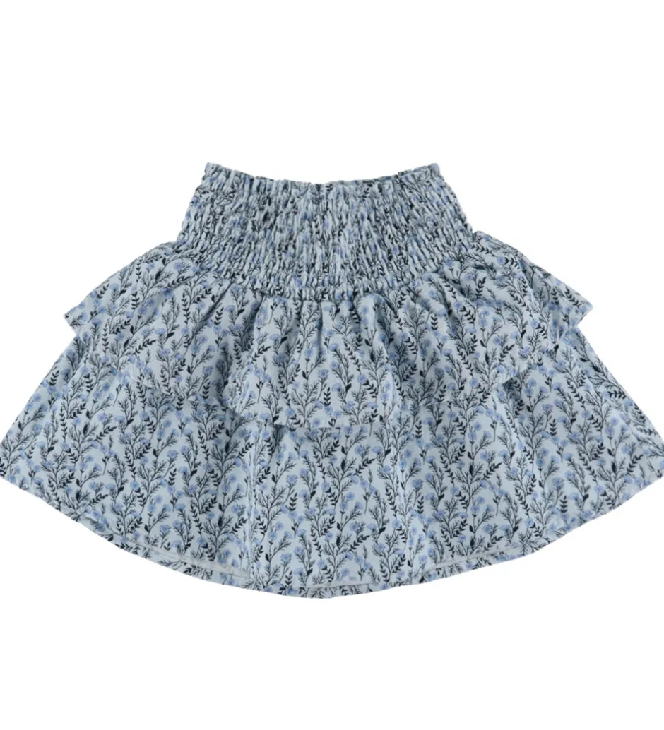 Smuk Name It nederdel i lyseblå med blomsterprint i blå nuancer. Nederdelen har smock i taljen og består af to lag i forskellige længder.