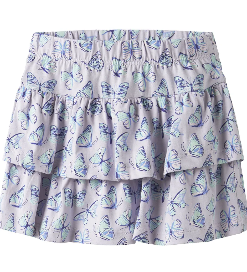Smuk Name It nederdel i lys lilla med et fint sommerfugleprint i blå, rosa og mintgrønne nuancer.