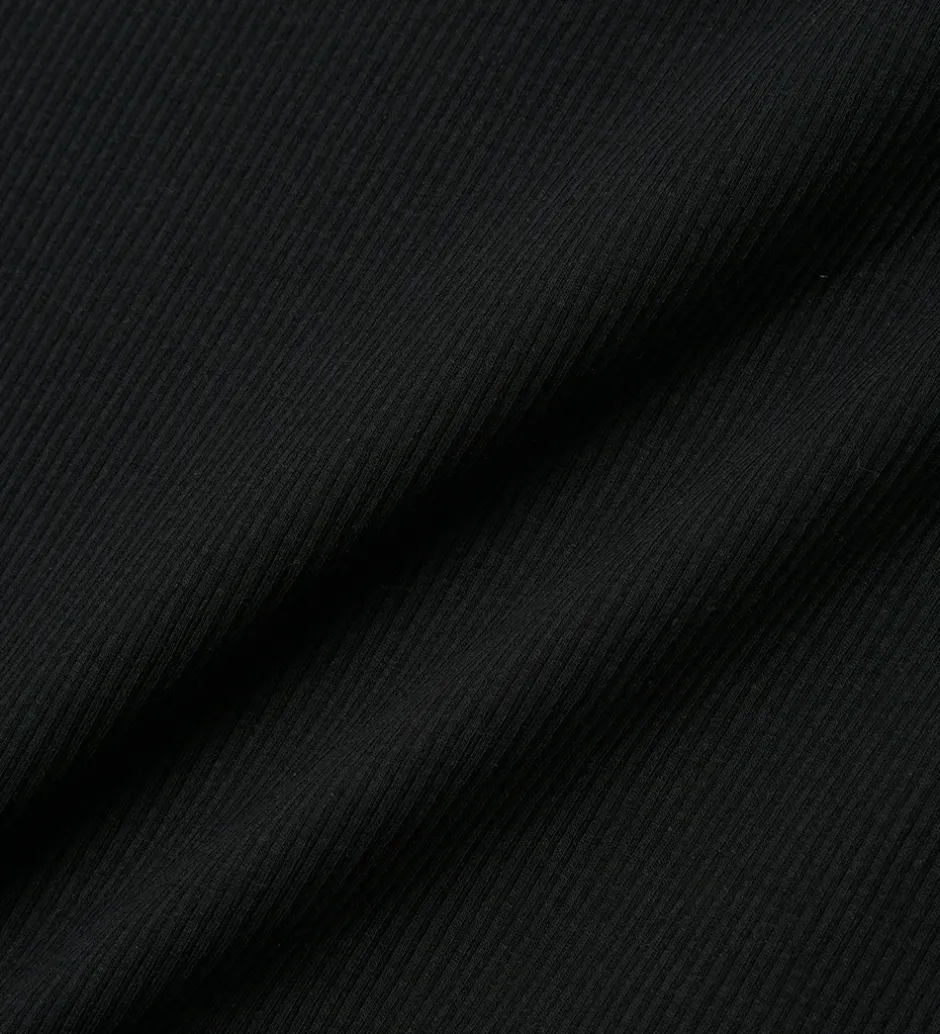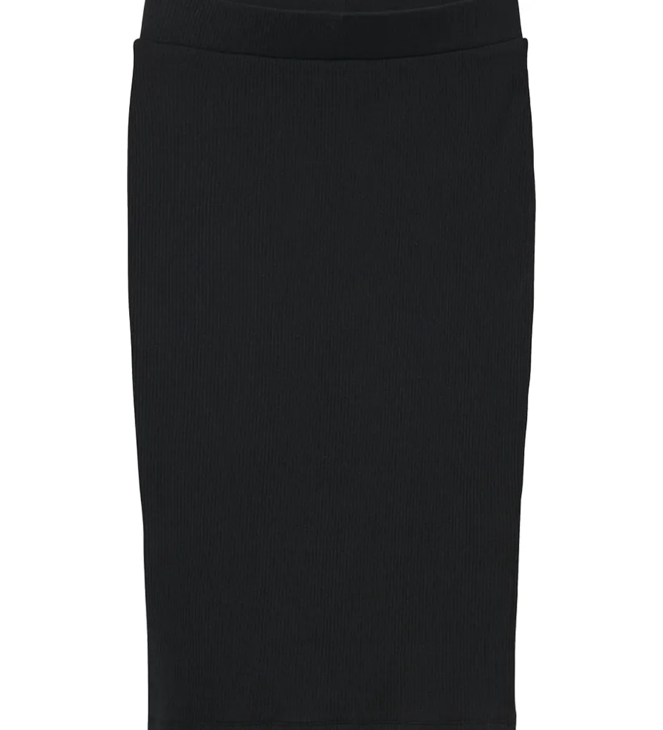 Elegant Name It nederdel i sort med ribstruktur. Nederdelen er en mellemlang model med tætsiddende pasform. Den har en bred elastik i taljen, og en slids nederst i begge side.