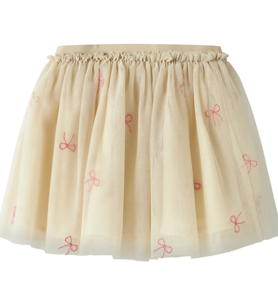 Fin Name It nederdel i beige med små, broderede sløjfer i rosa. Nederdelen har en god elastik i taljen, og består af et lag genanvendt polyester inderst og to lag tyl udenpå.