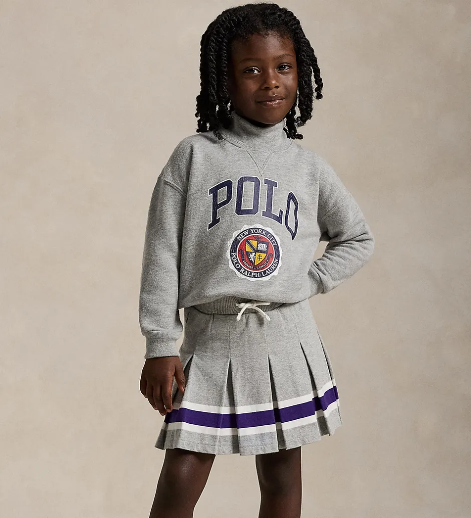 Smart Polo Ralph Lauren tennisnederdel i meleret grå, og langs den nederste kant er der en bred, lilla stribe med hvide striber.