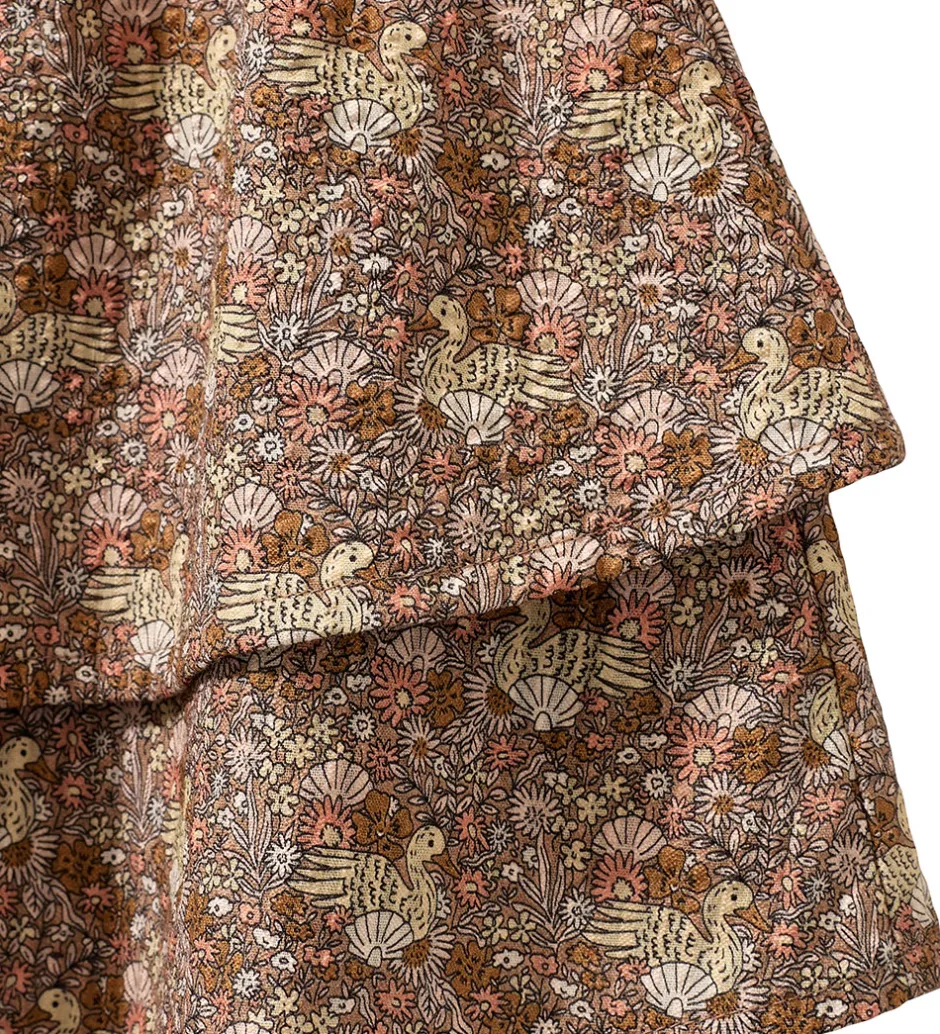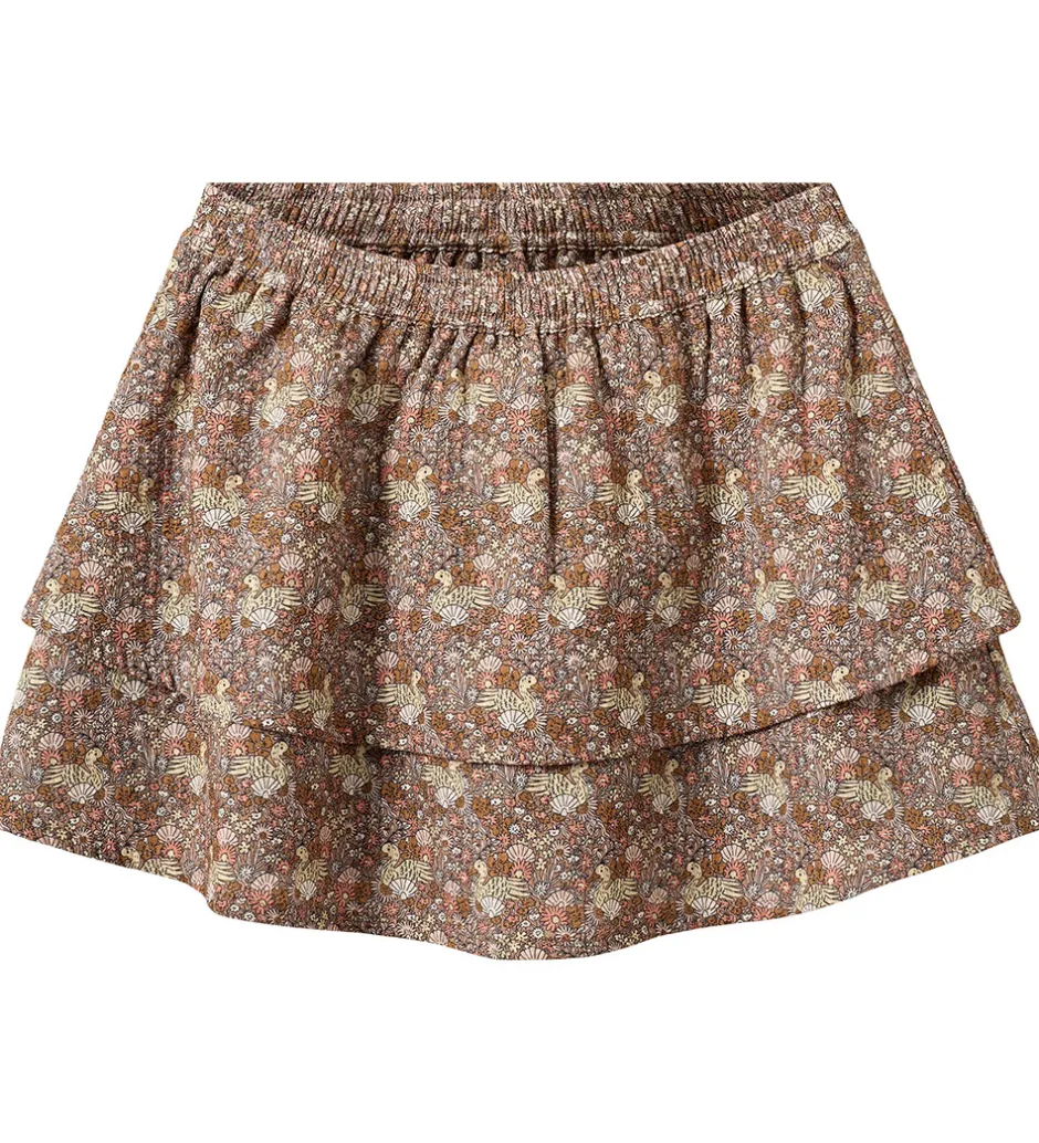 Charmerende Sofie Schnoor nederdel i brun med et detaljeret blomsterprint med ænder og muslinger i rosa, orange og gule nuancer.
