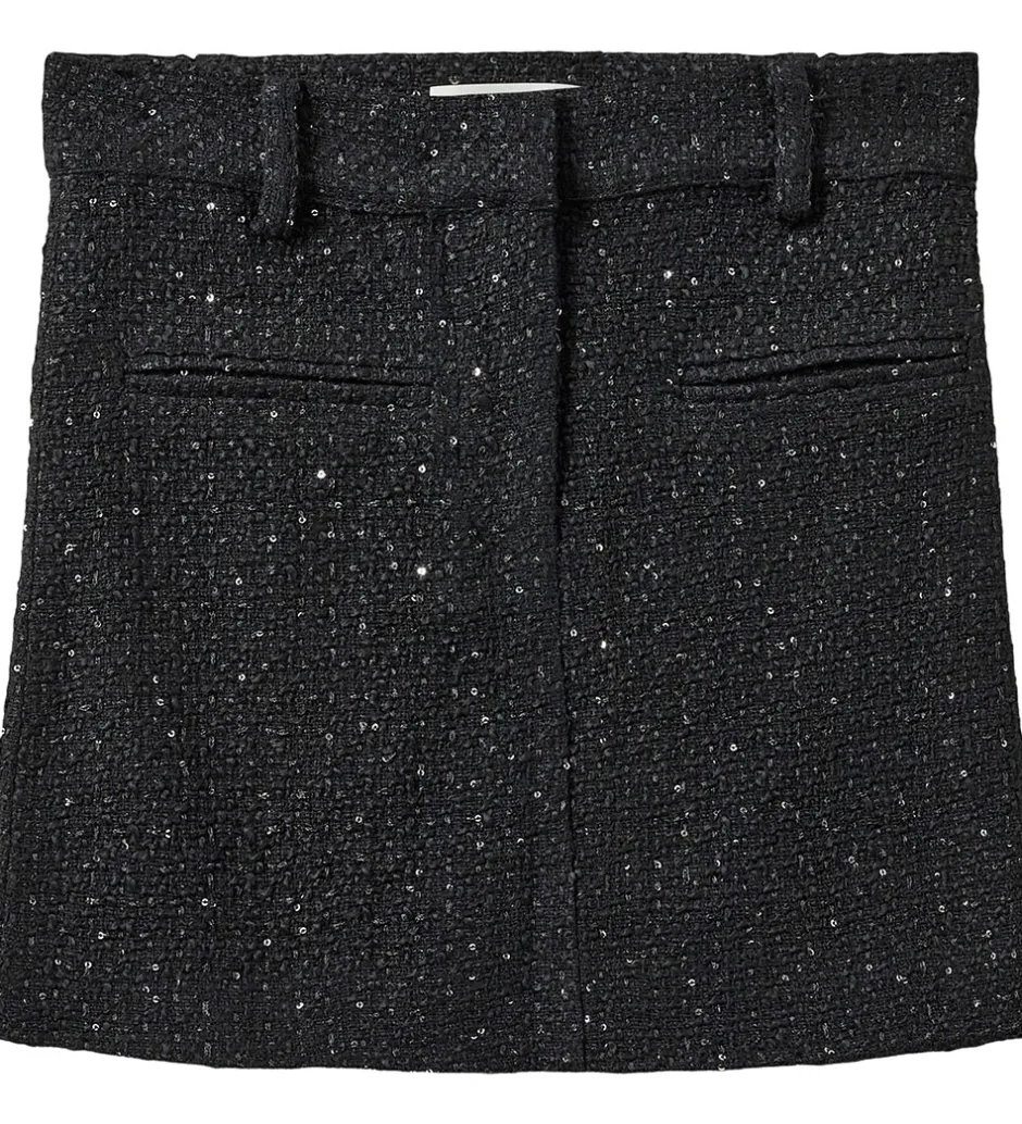 Lækker Sofie Schnoor nederdel i sort med glitrende palietter, der tilføjer et festligt touch. Nederdelen åbnes fortil med hægte og lynlås.