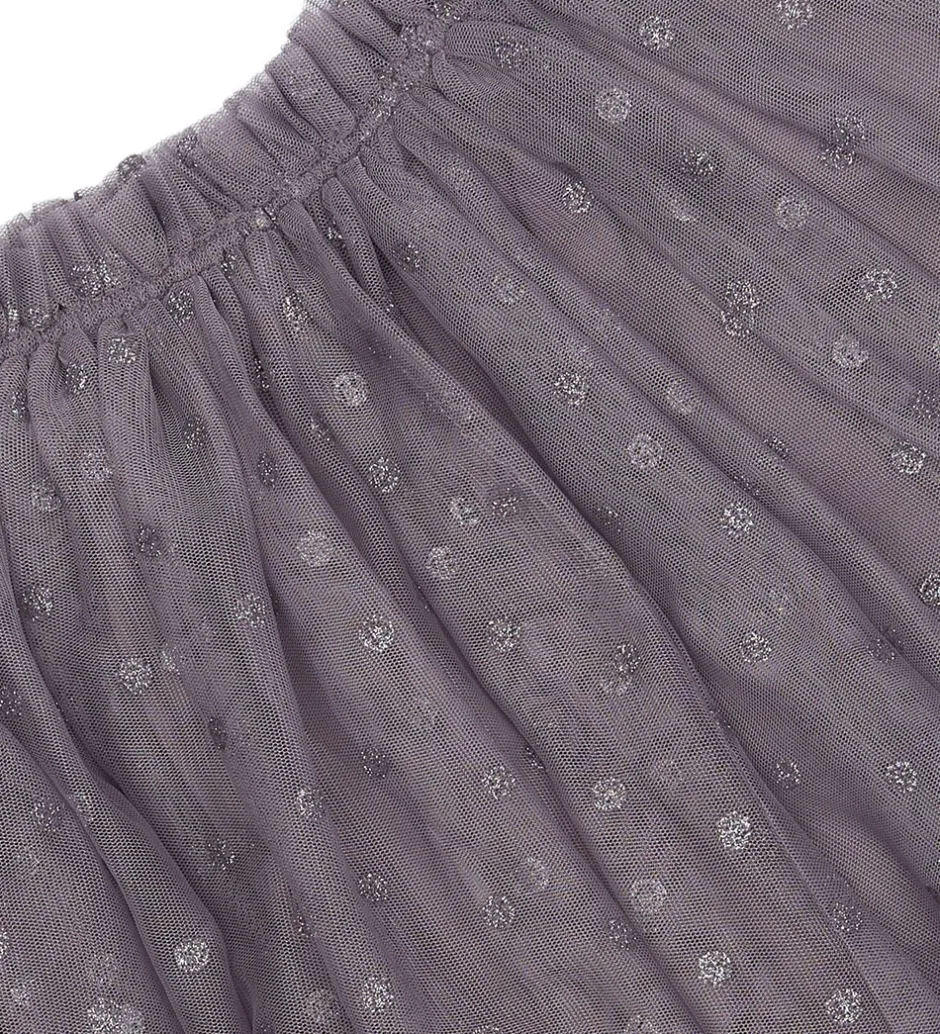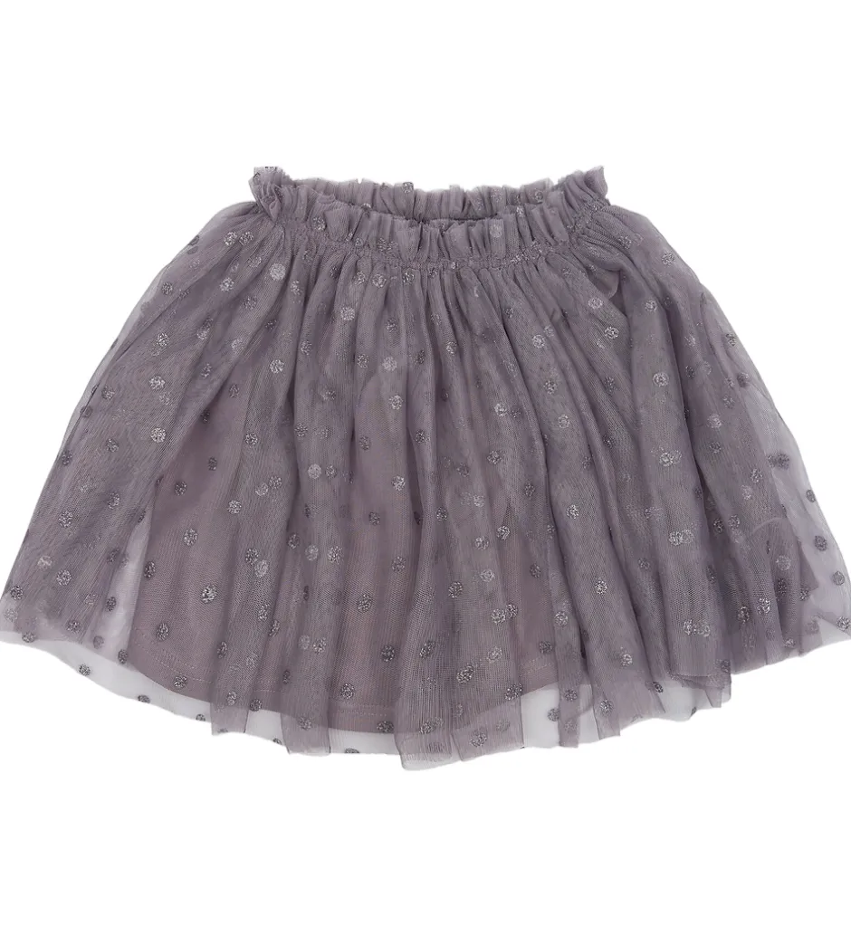 Yndig nederdel fra The New Siblings i støvet lilla tyl og med små sølvglimmer smileys over det hele. The New Siblings nederdelen har en elastisk talje, som sikrer en god pasform og har desuden et blødt og glatvævet underskørt, så den ikke fremstår gennemsigtig.
