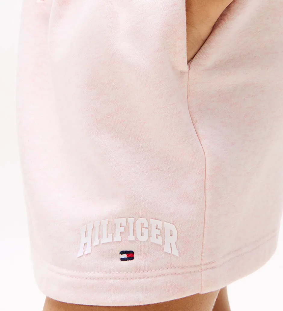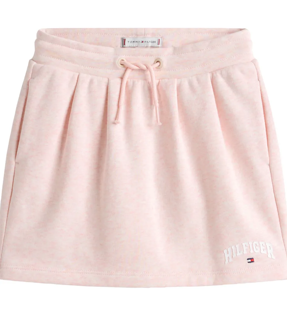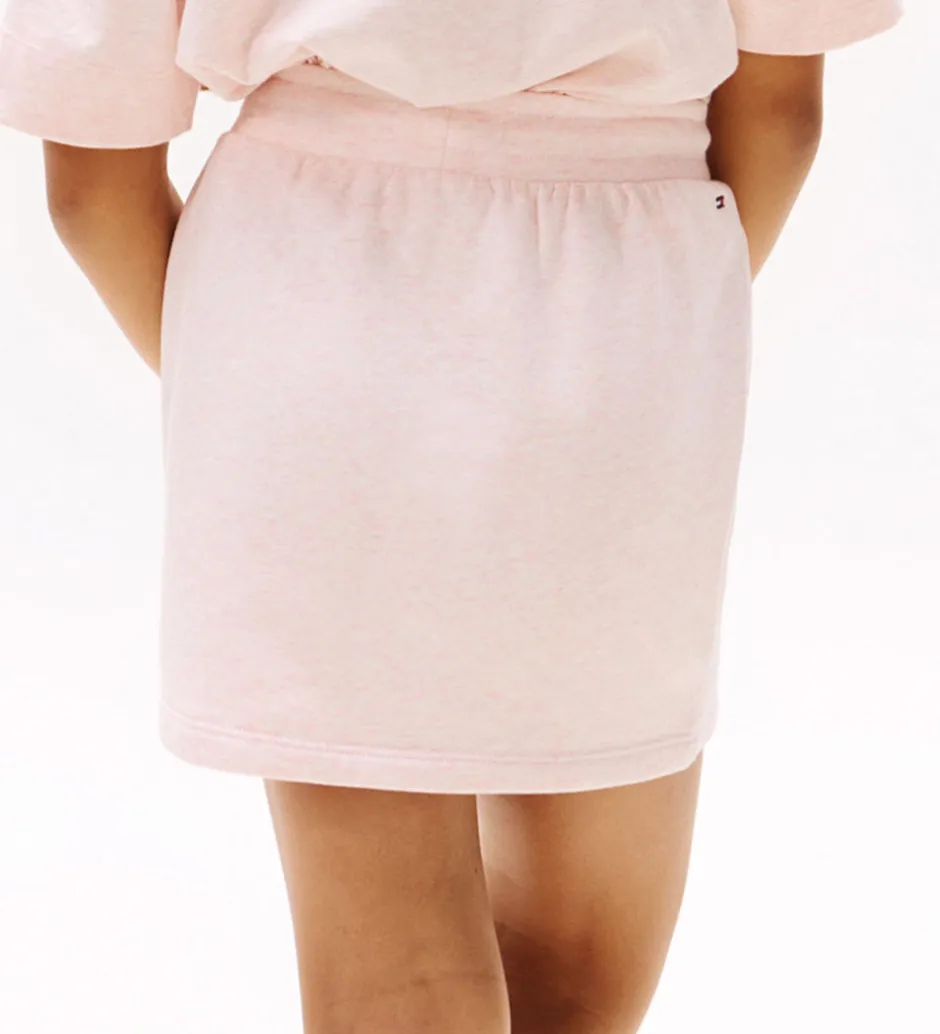Fin Tommy Hilfiger nederdel i en blød lys rosa sweatkvalitet med et stort logoprint på fronten i hvid. Nederdelen har en behagelig pasform med stræk og snøre i taljen for bedre justering.