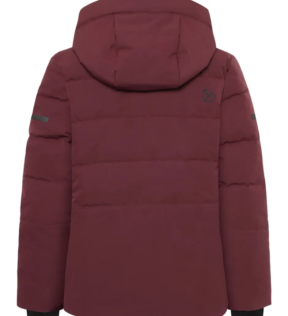 Skøn Didriksons dynejakke i en flot, mørkerød nuance med vandrette syninger og en sort logoapplikation på brystet samt velplacerede reflekser.