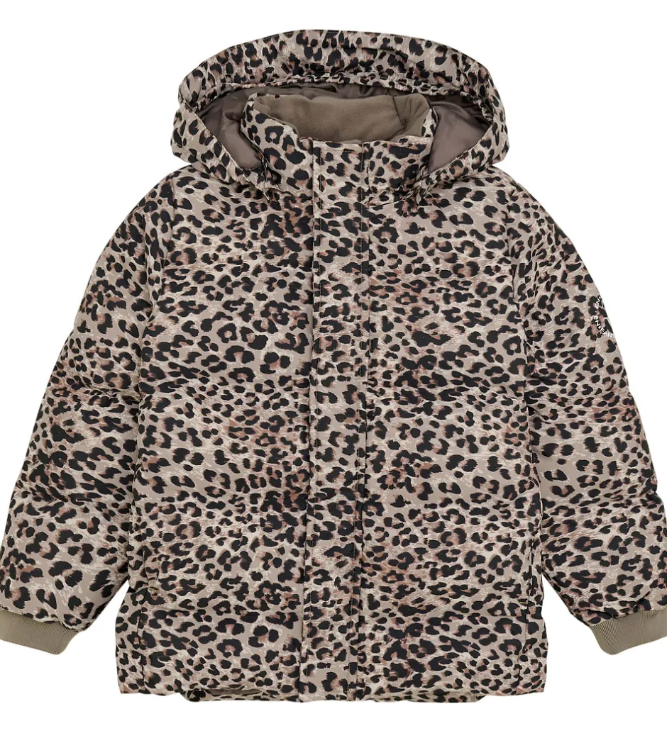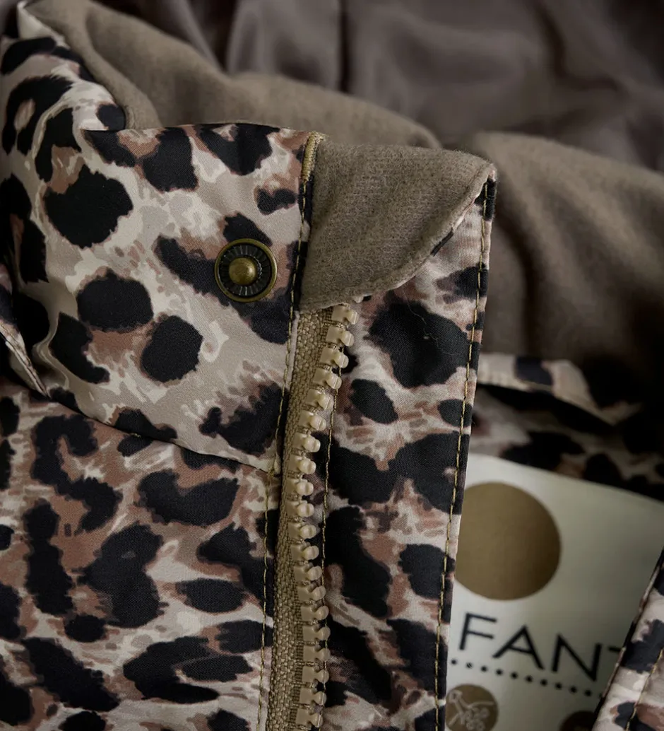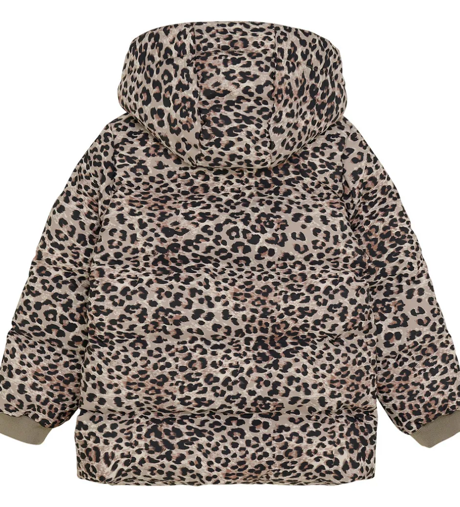 Sød En Fant dynejakke med et leopardmønster i sort og beige samt med indprægede, vandrette linjer.