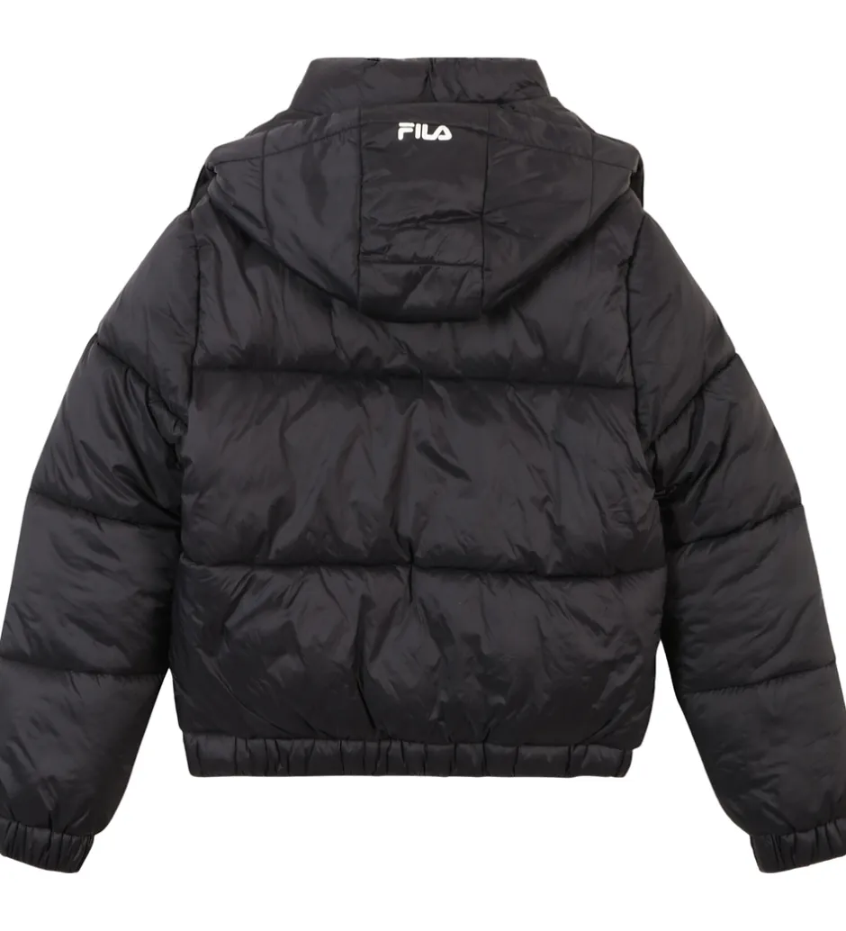 Elegant Fila dynejakke i klassisk sort med vandrette syninger og et diskret, hvidt logo på venstre bryst.