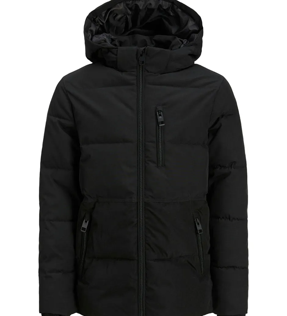 Stilren Jack & Jones dynejakke i klassisk sort design. Dynejakkens struktur omfatter vandrette syninger, der giver et moderne udtryk.