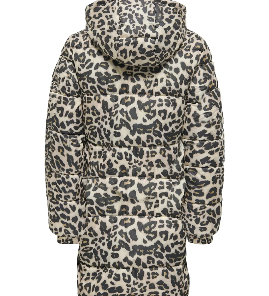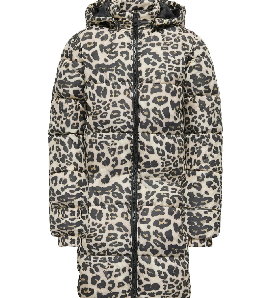 Flot Kids Only dynefrakke med et iøjnefaldende leopardmønster i nuancer af beige, brun og sort. Dynefrakken har en lang, lige pasform og er udstyret med en fastsyet hætte. Foran åbnes dynefrakken med en praktisk lynlås, der strækker sig helt op til halskanten. Kids Only dynefrakken har lange ærmer med elastiske manchetter, der sikrer et godt fit.