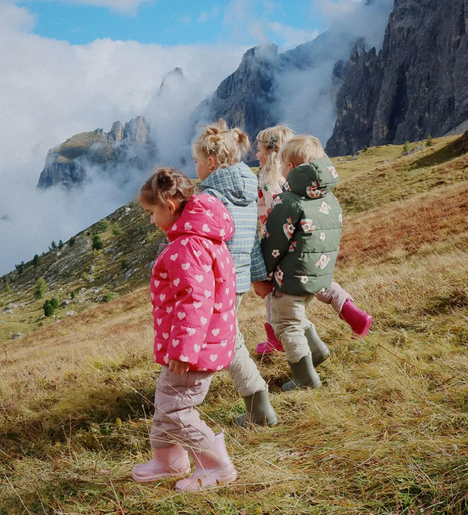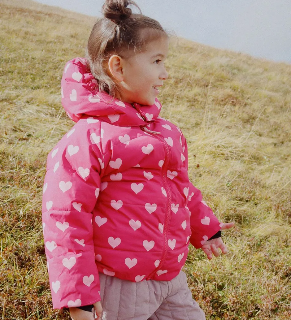 Sød Konges Sløjd dynejakke i en frisk rosa med et alloverprint af lyserøde hjerter. Dynejakken er med vandrette syninger.