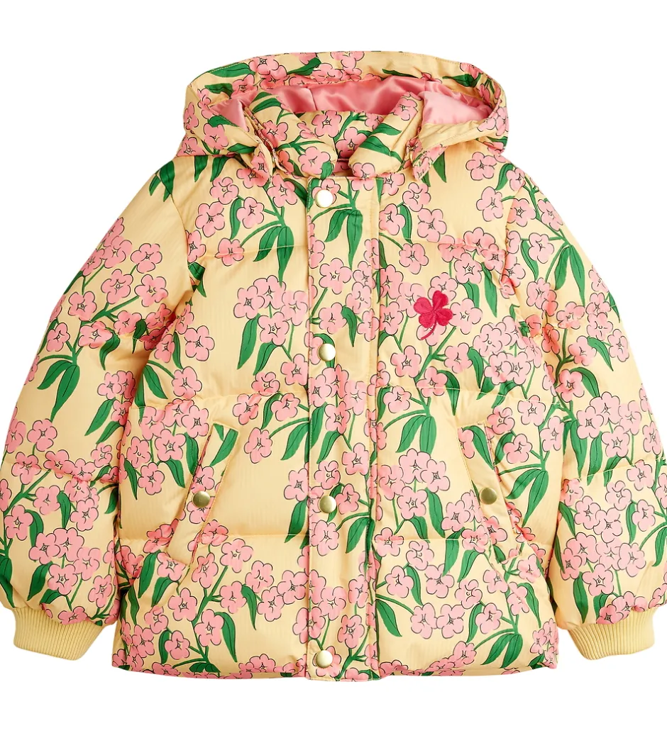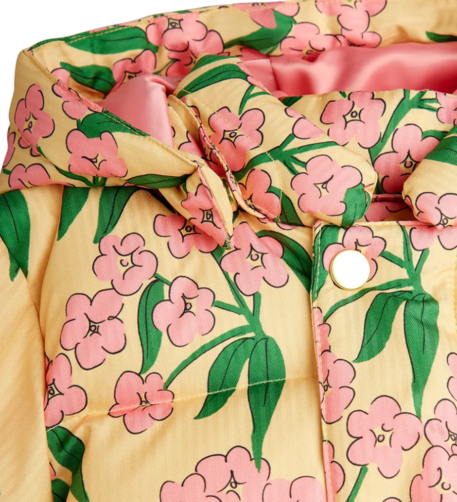 Charmerende Mini Rodini dynejakke, der præsenterer et farverigt blomsterprint med lyserøde blomster og grønne blade mod en varm gul baggrund. Denne dynejakke er designet med en aftagelig hætte, som sidder fast med trykknapper, og ærmerne har brede ribkanter.