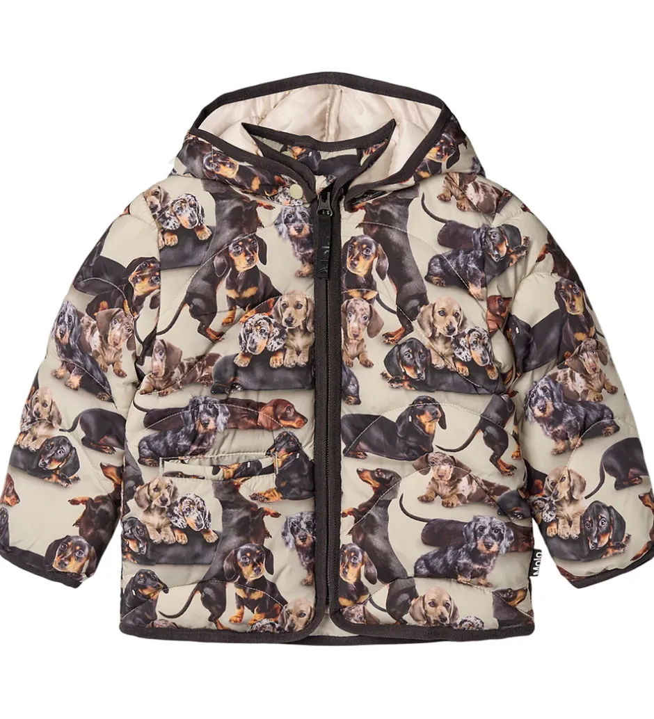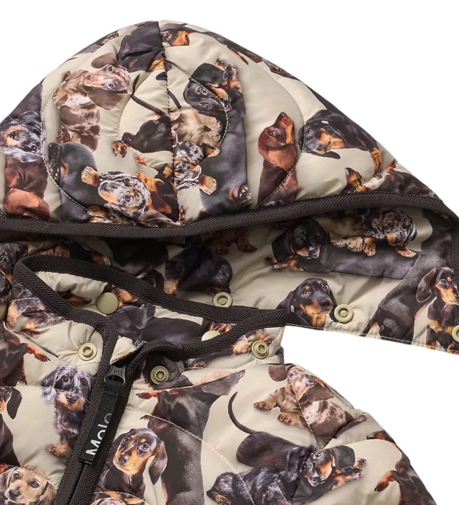 Dejlig Molo dynejakke med et unikt print af forskellige hunde, der dækker hele overfladen. Dunjakken er i nuancer af beige med sorte, beige og brune detaljer og har bølgende syninger.