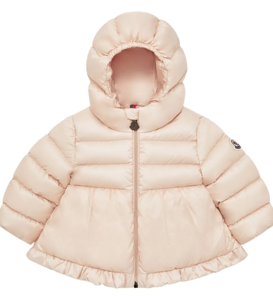 Sød Moncler dunjakke i ensfarvet lys rosa, og øverst på venstre ærme er der et filt-mærke med et Moncler-logo.