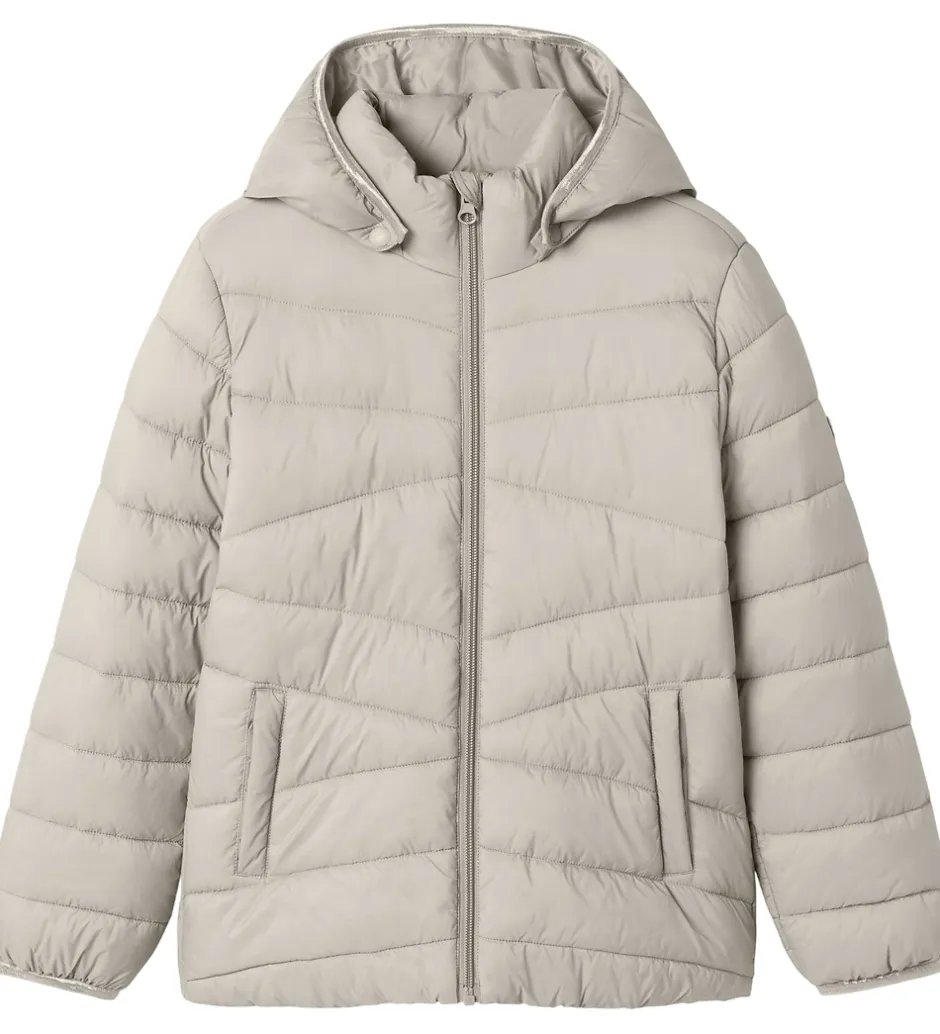 Elegant Name It dynejakke i en stilren beige nuance. Dynejakken har et quiltet design, hvor syningerne danner brede, vandrette paneler, der skaber et klassisk look.