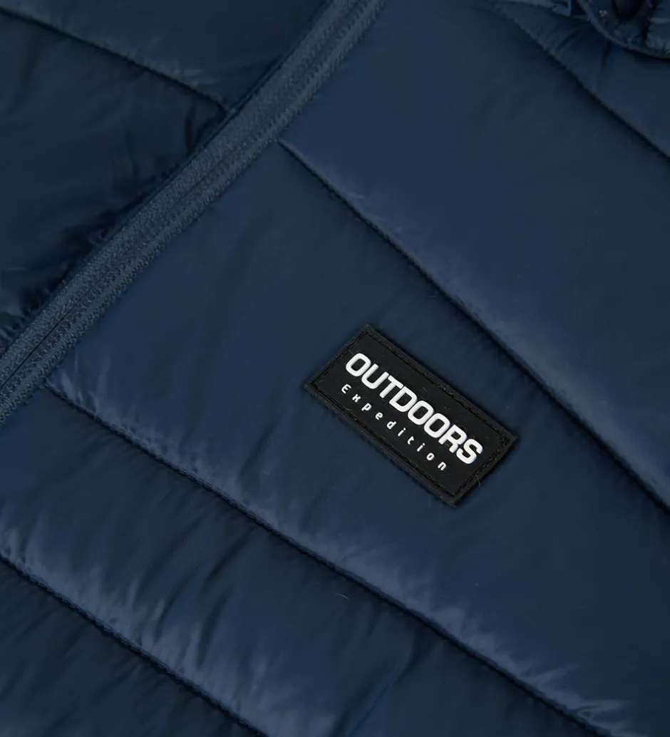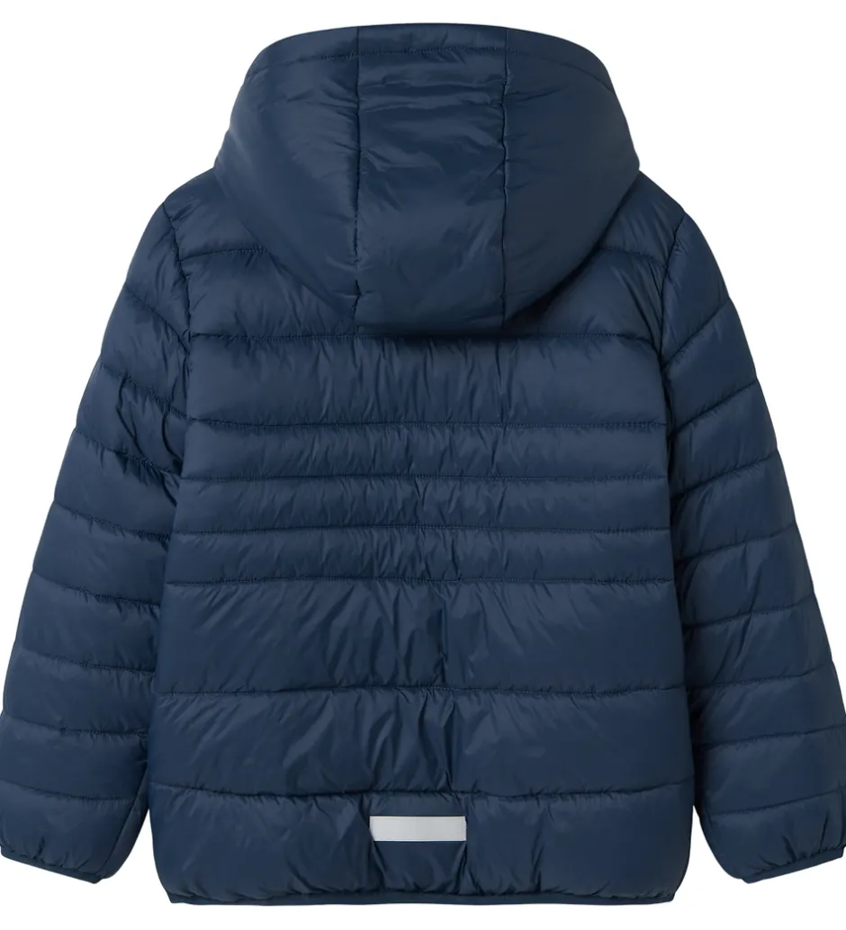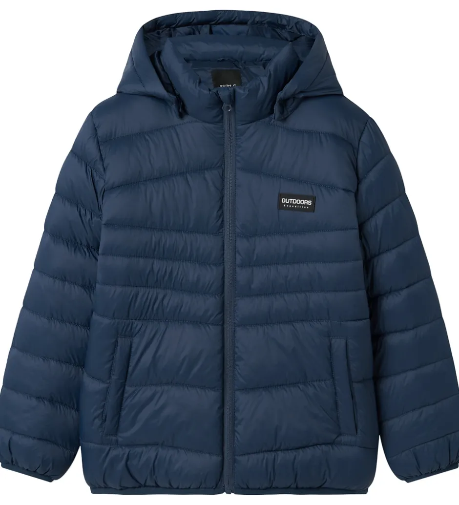Flot Name It dynejakke i dyb blå med et diskret firkantet logo på venstre bryst. Dynejakken har vandrette syninger, der skaber en ensartet overflade.