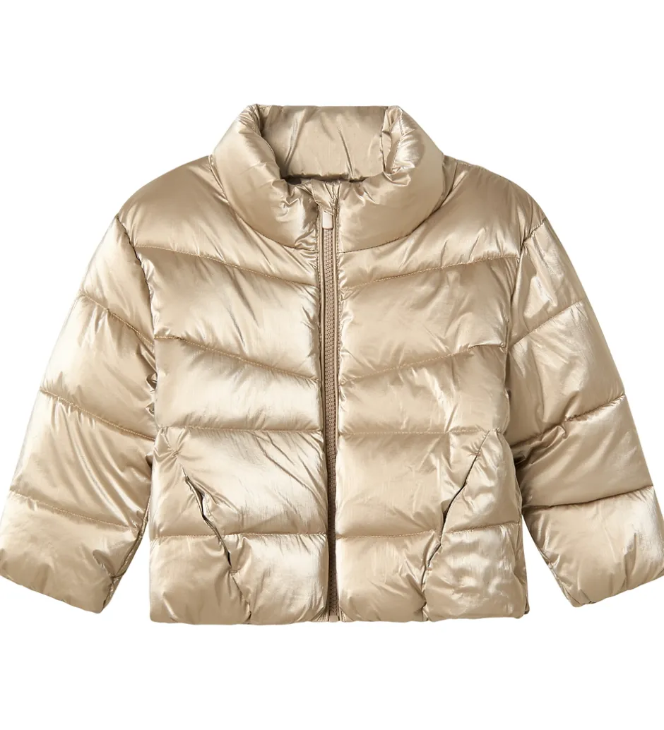 Elegant Name It dynejakke i en skinnende, gylden nuance. Dynejakken har brede vandrette syninger, der giver et klassisk look og en struktureret overflade. Farven tilføjer et moderne touch til designet, og materialet fremstår med en høj glans.